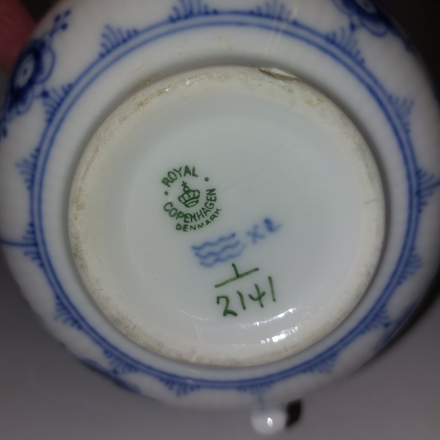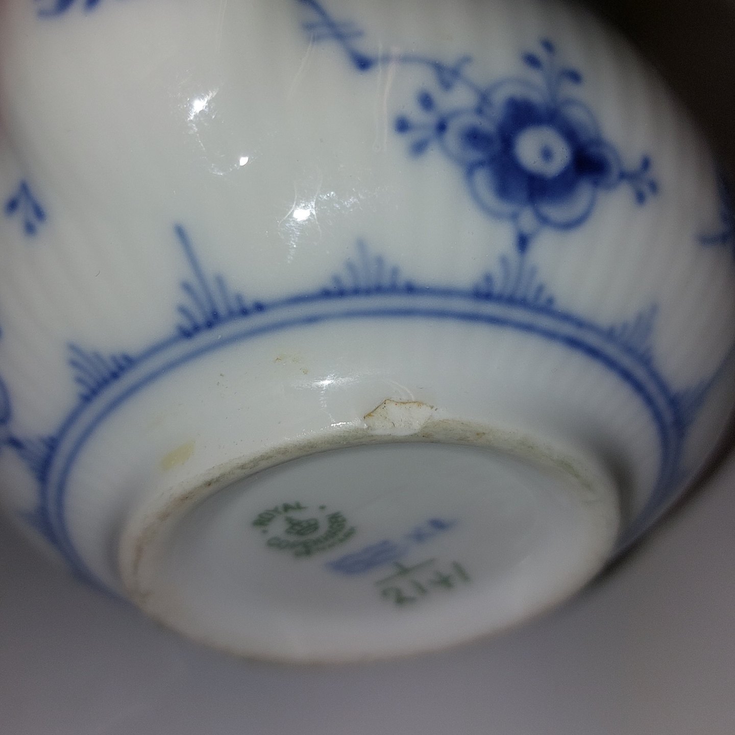 Musselmalet flødekande i porcelæn fra Royal Copenhagen. Fabriksmærket på bunden sammen med modelnummer 2141. Har et lille skår på bundens kant (se fotos). Ellers I god stand. 1. Sortering. Mål: H. 7 cm L. 14,5 cm