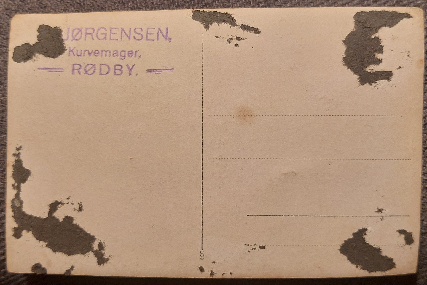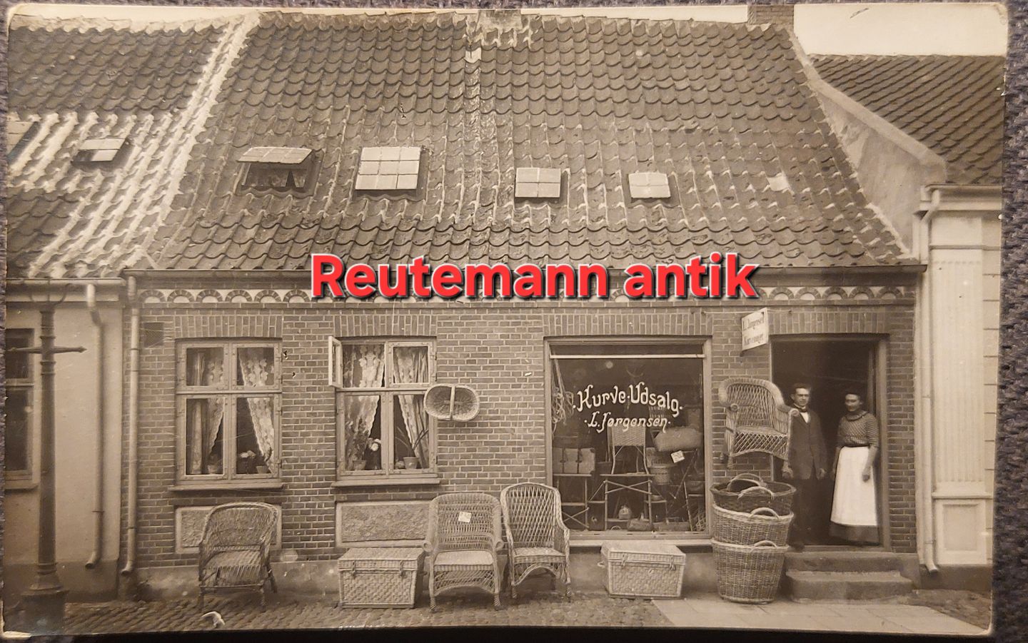 Ubrugt postkort: Butiksfacade I Rødby, Kurvemager fra 1920'erne. Taget ud af fotoalbum. Spor herfra på bagsiden.