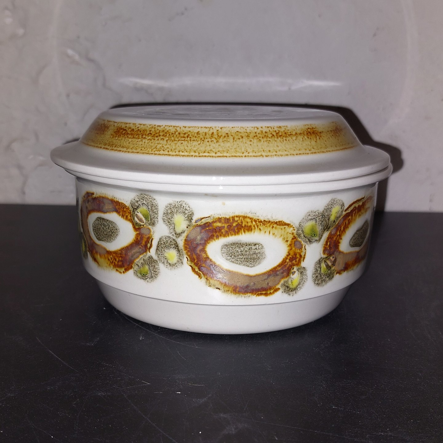 Royal Copenhagen Nucella, skål med låg I fajance. I god stand. 1..sortering. Designet af.Ellen Malmer. Mål: H. 9.5 cm.Ø. 16.5 cm