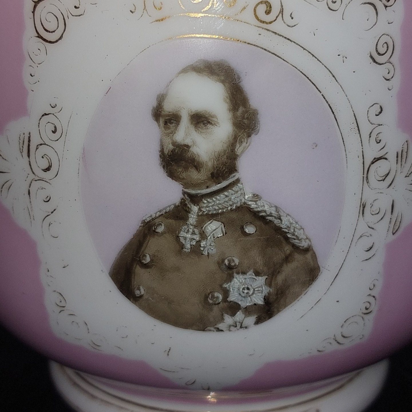 Rosa malet urtepotteskjuler i porcelæn fra slutningen af 19. århundrede, med malet portræt af Kong Christian IX. Lidt slid på guldet ellers intet at bemærke. I god stand uden skader eller reparationer. Ikke fabriksmærket. Mål:.H. 18,5 cm. Åbningen diameter er 17,5 cm.