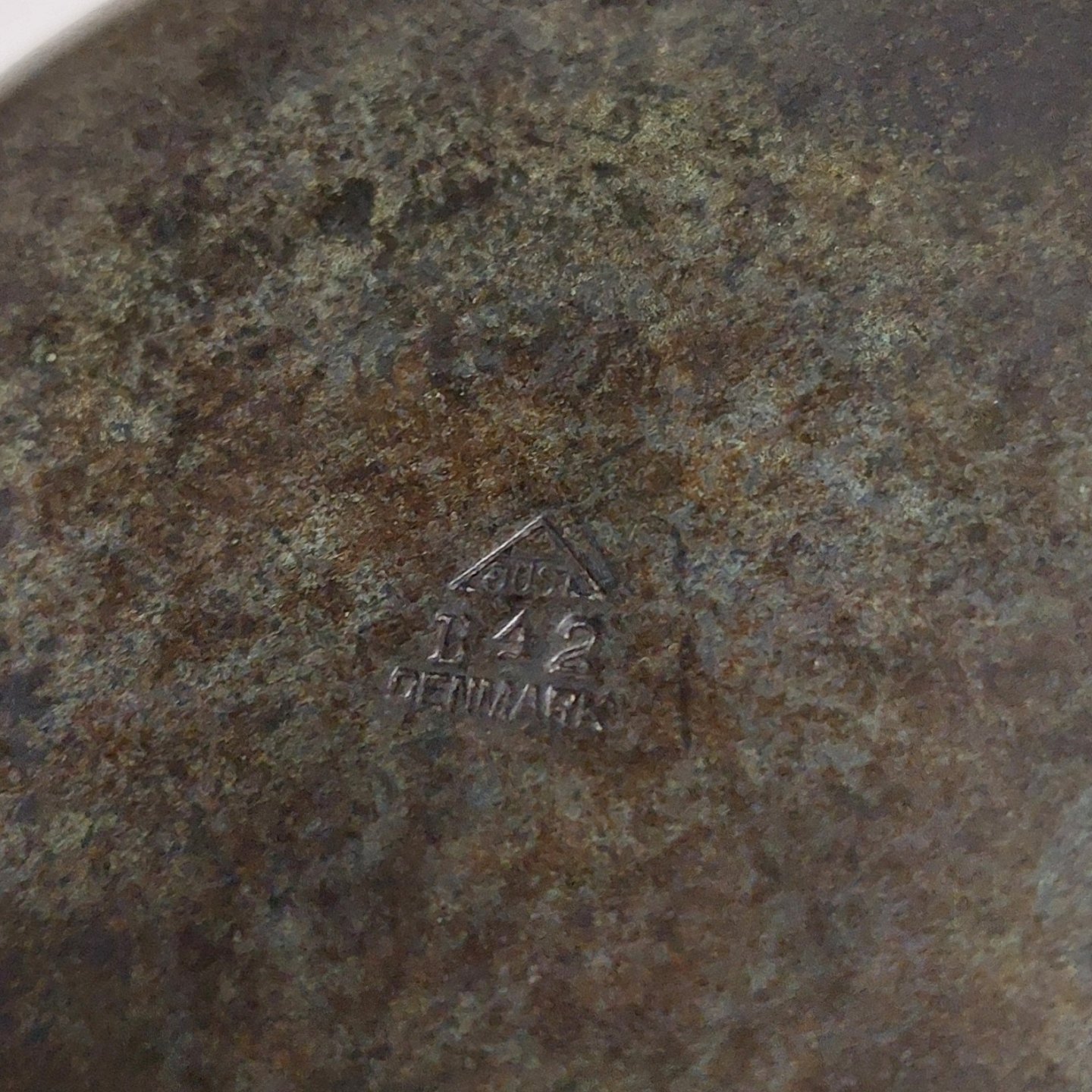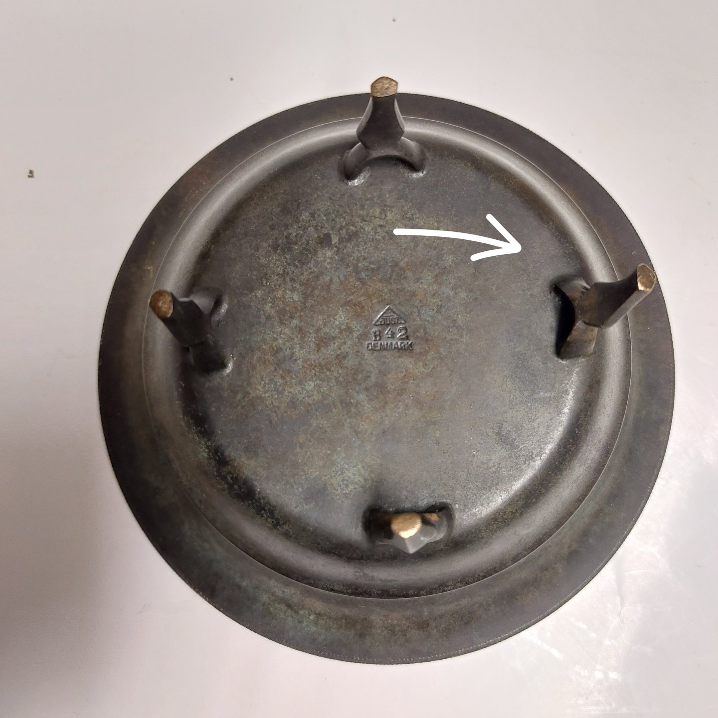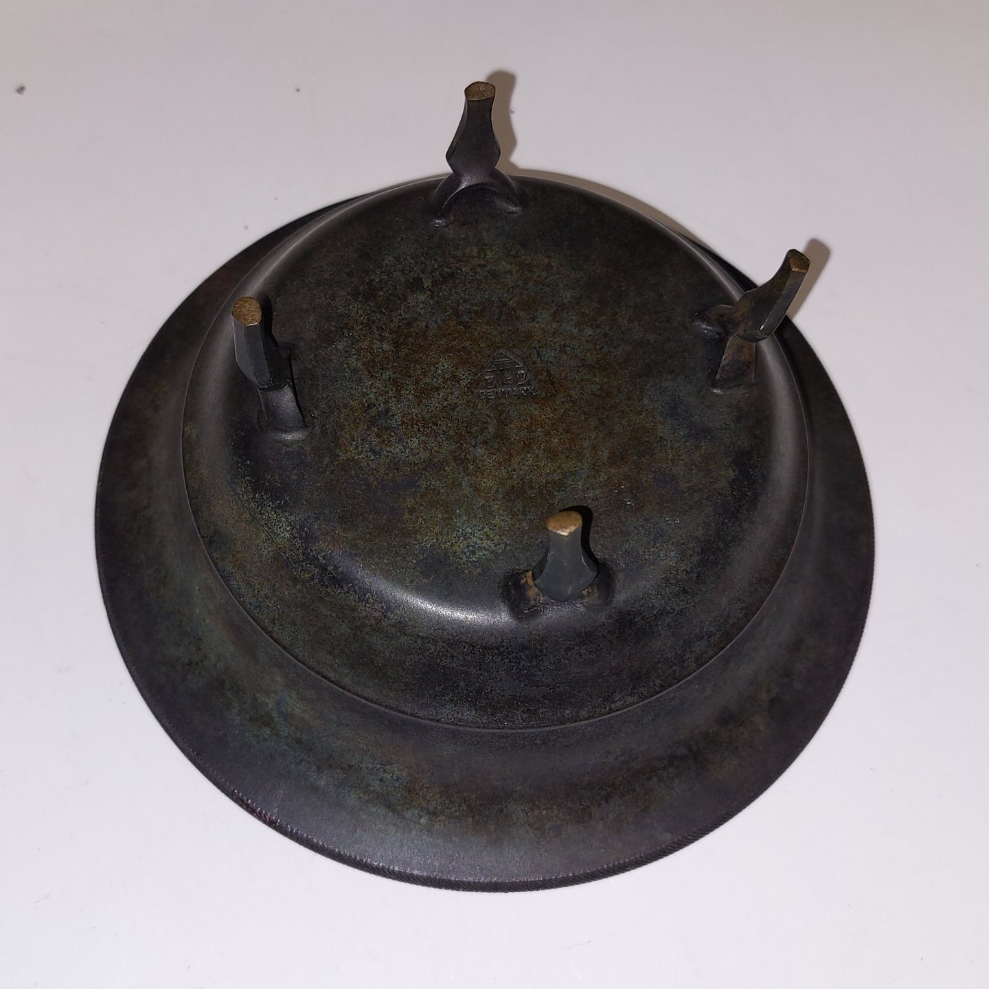 Just Andersen bronceskål på fire ben..Flot patina og ingen skader eller reparationer. Ben lidt bukket. Bør dog kunne rettes op. Fabriksmærket på bunden bl.a. med modelnummer B42. Mål: H. 6,5 cm Ø. 15,3 cm