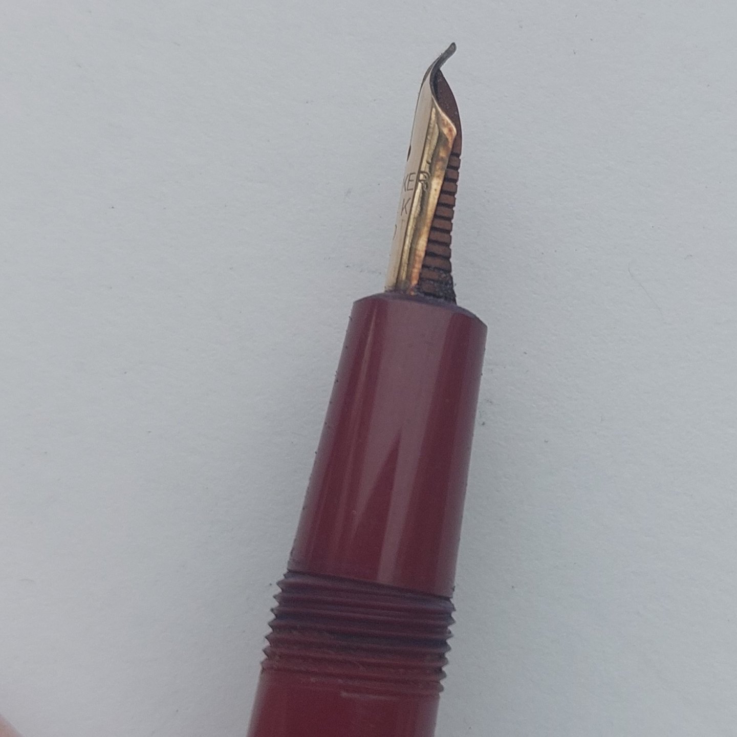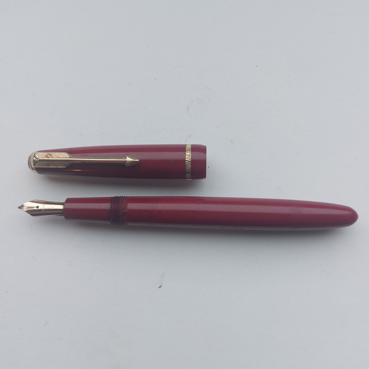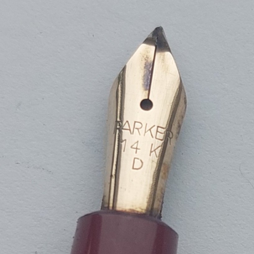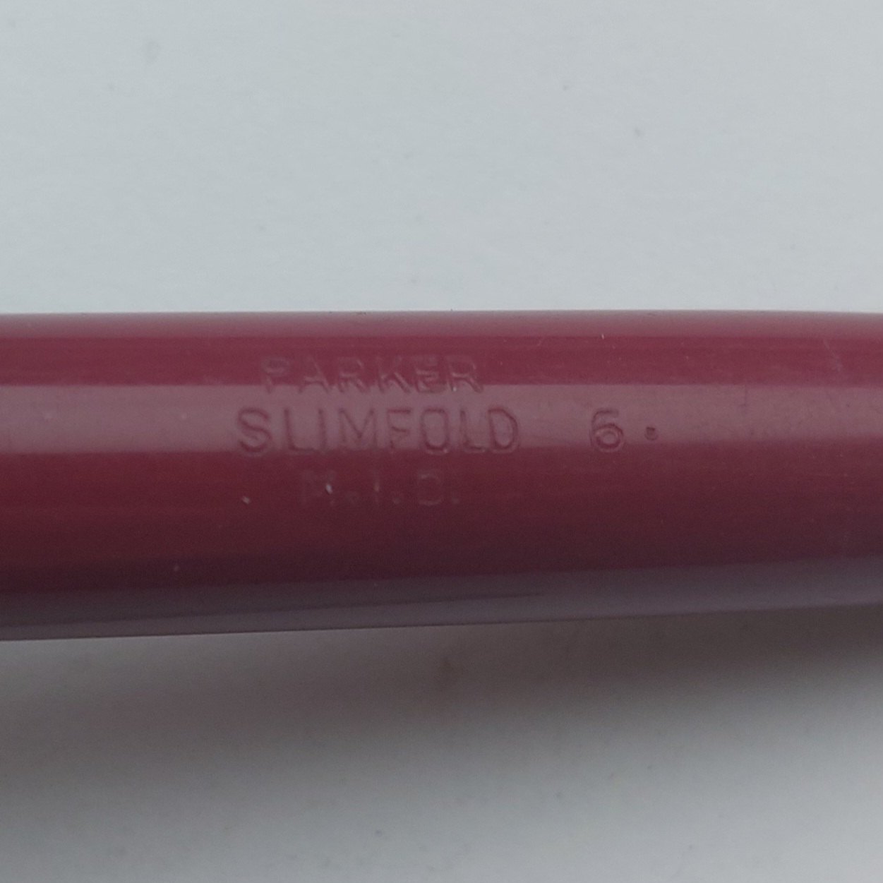 Slank bordeaux Parker Slimfold 6..M.I.D. (Made In Denmark) fyldepen. Fremstillet omkring 1960. Fremstår I god funktionsduelig stand uden skader eller reparationer. Alle dele originale Parker dele. L. 12,7 cm.