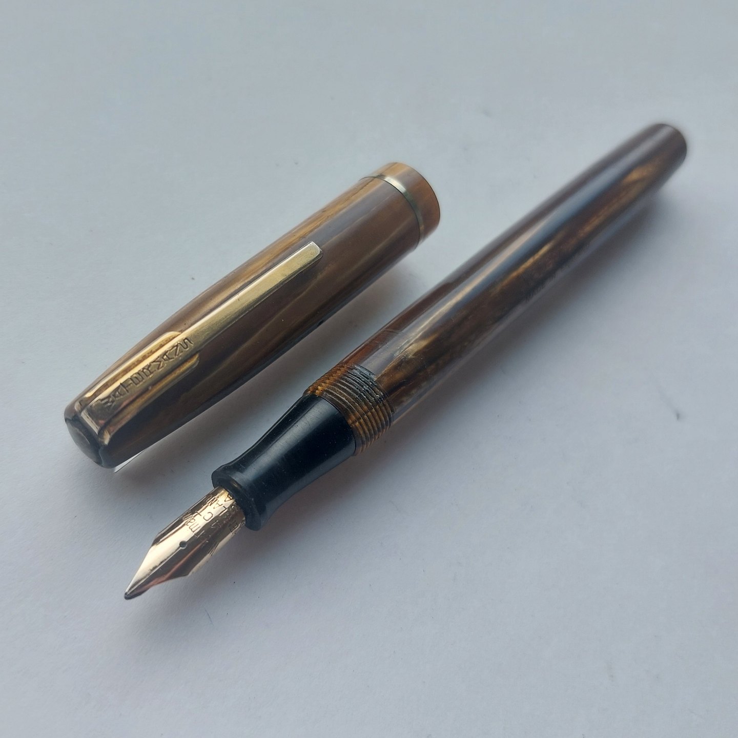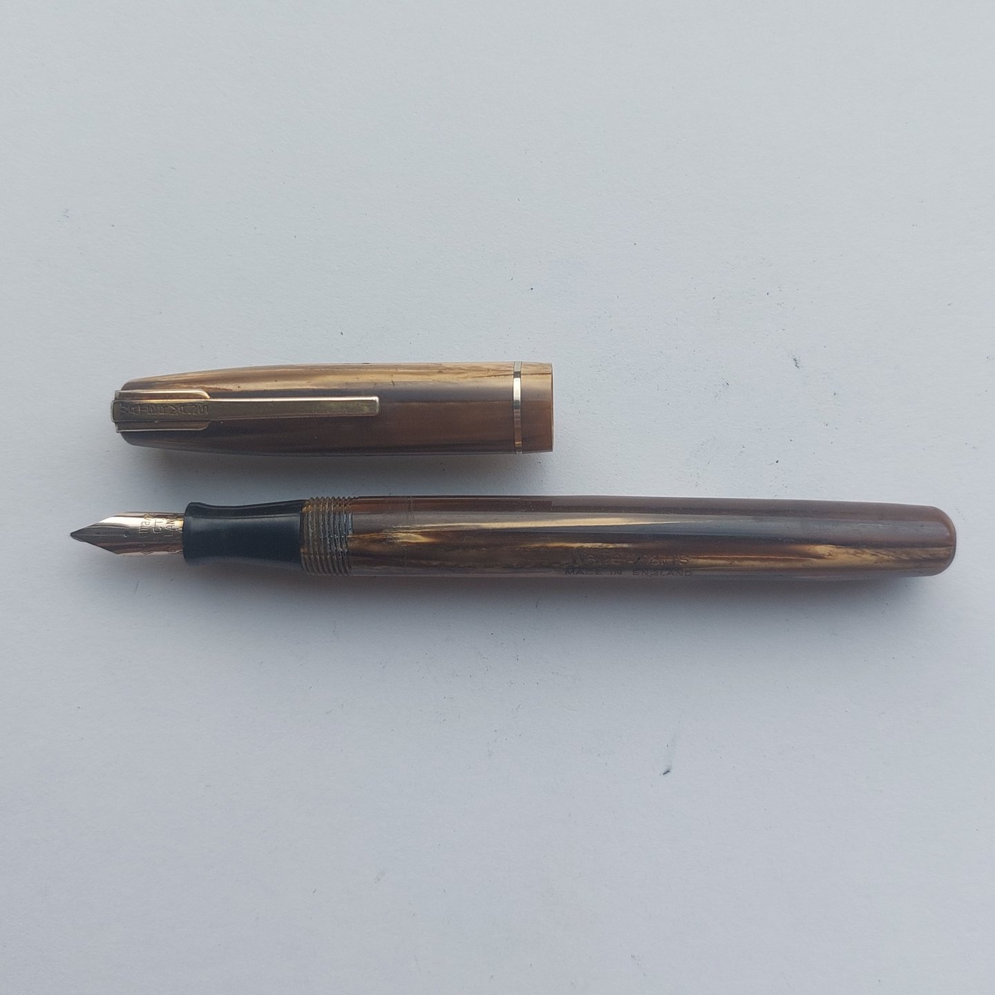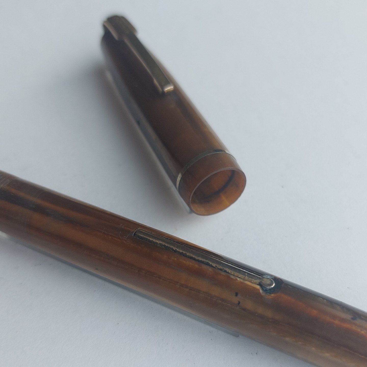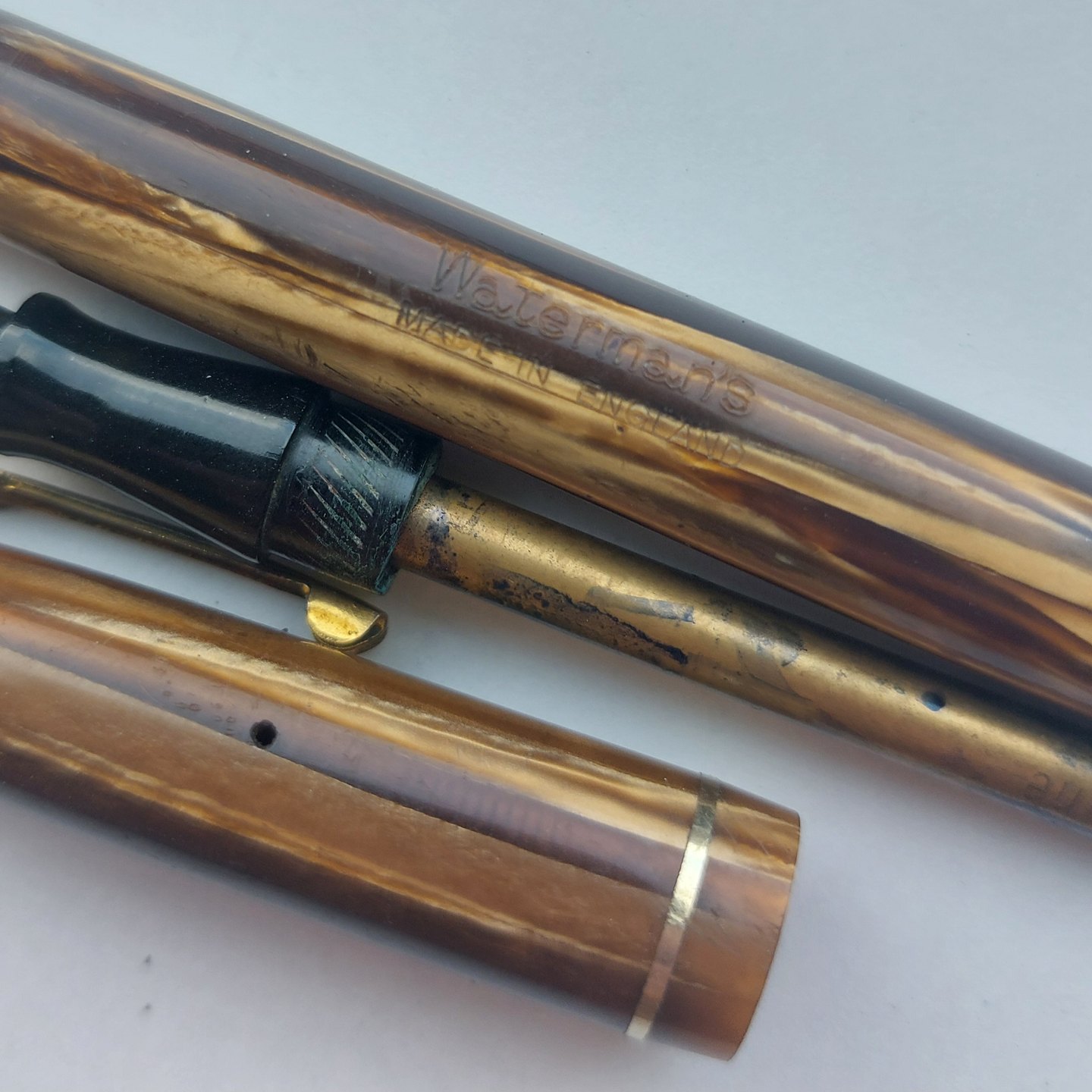 Transformed green-striped Waterman's fountain pen. Made in England. Transformed into a "ball point pen". As can be seen from the pictures, there is a (now unusable) ball point refill. There is therefore little work to get it back to its original function - as a fountain pen with liver filler. Sold in the condition shown in the pictures. No damage (cracks, chips). L. 12.8 cm