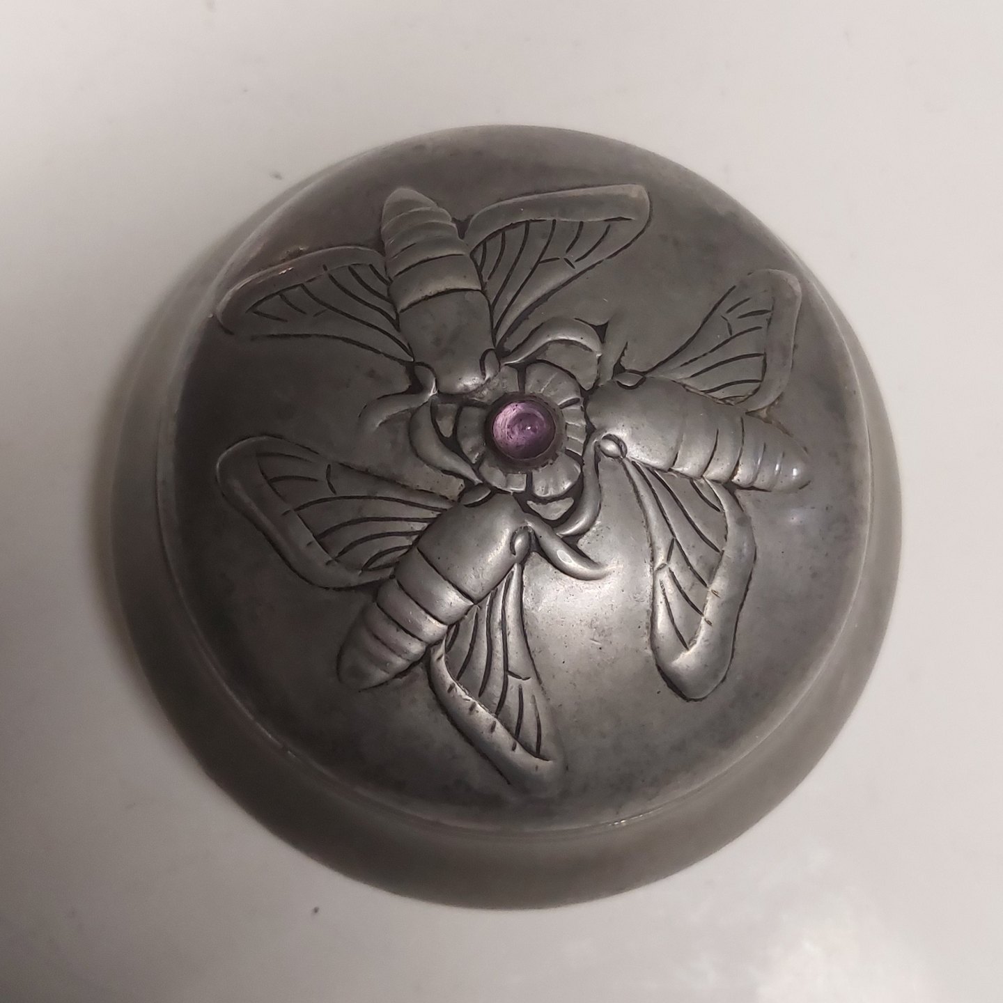 Mogens Ballin's Eftf.: Lågskål I tin med dekoration af bier på låget fra Hans Peter Hertz værksted, hvor man opfandt nye emner, men også fortsatte.med at producere effekter fra Ballin-perioden i Skønvirkestil.Mindre bule på siden. Mål: H. 8 cm inclusiv lilla sten. Underskoven diameter på midten måler 11,5.cm.