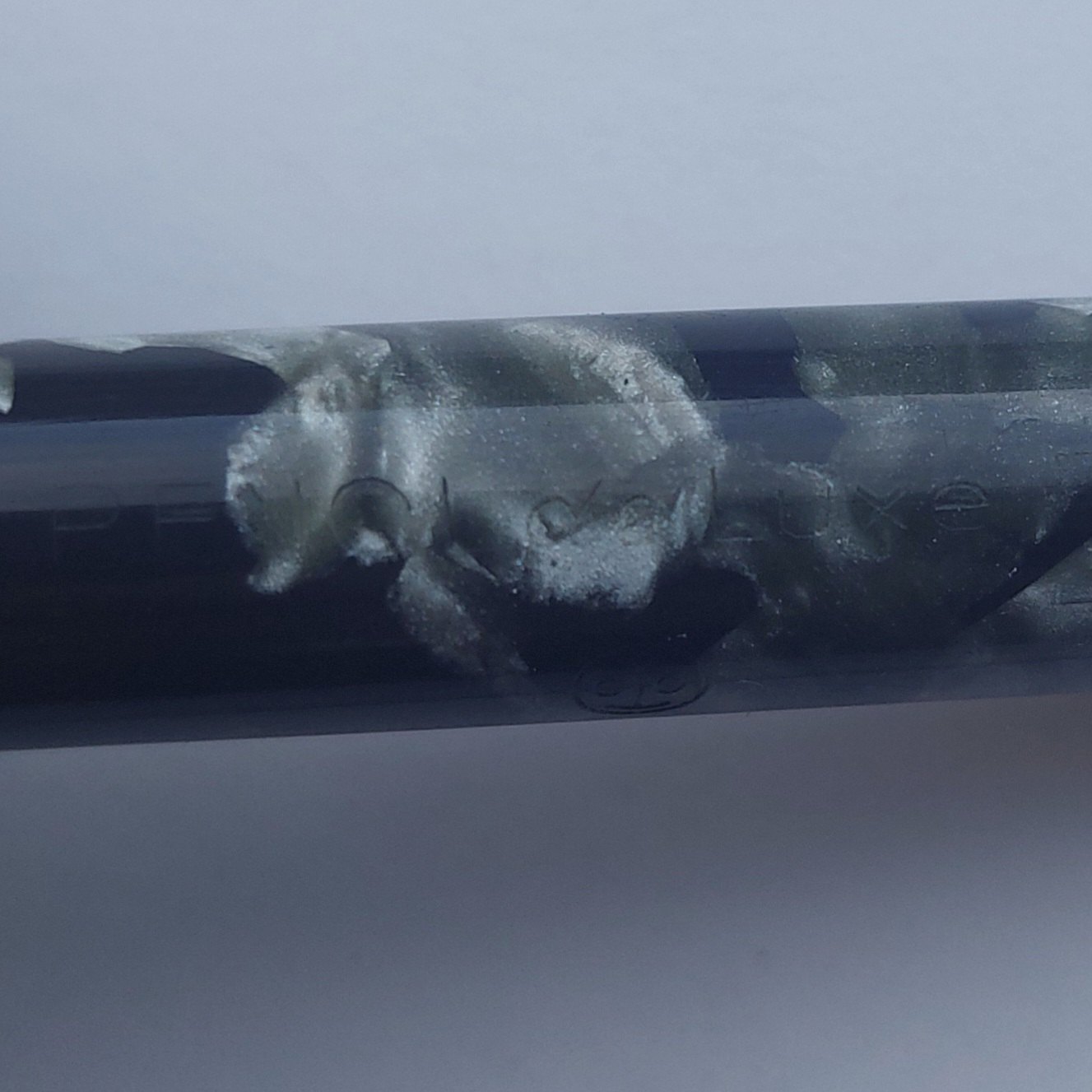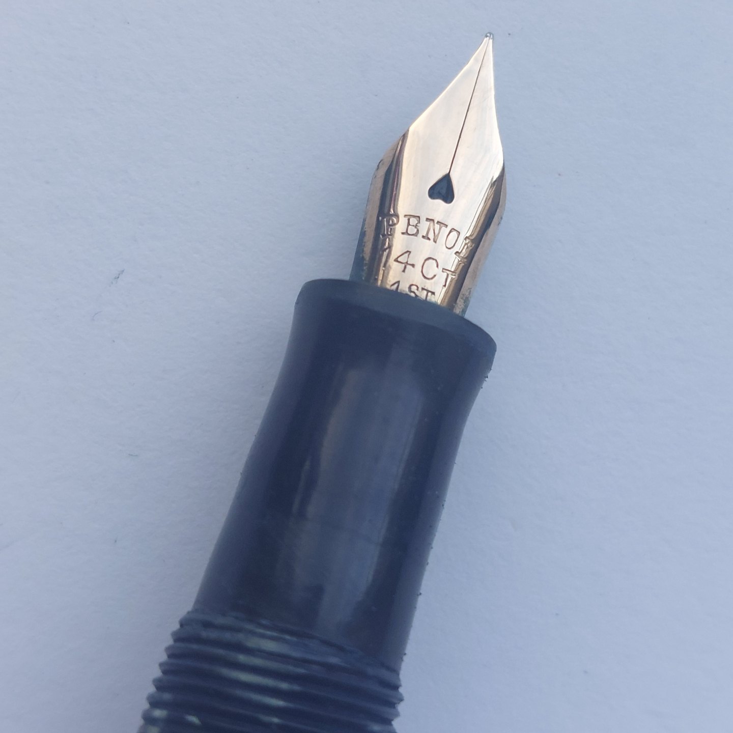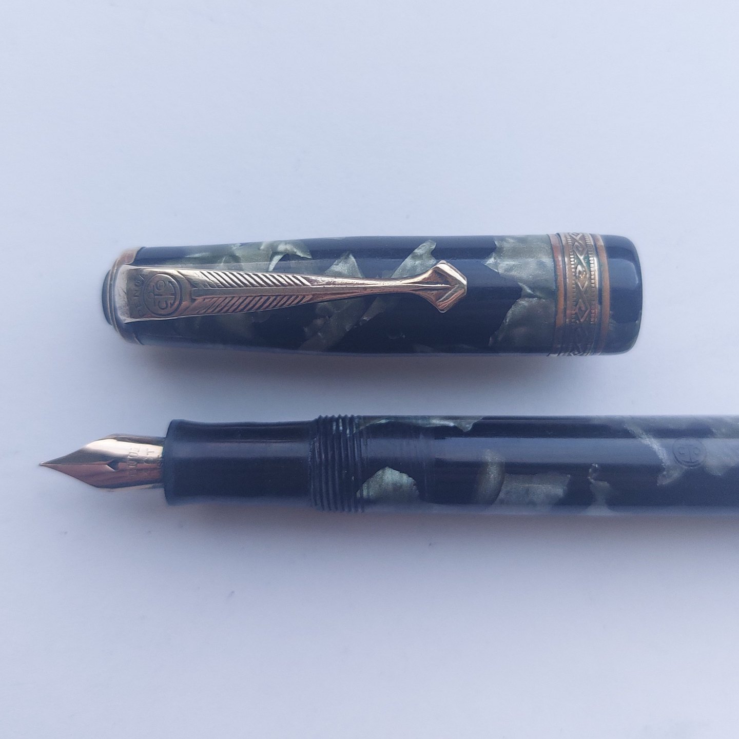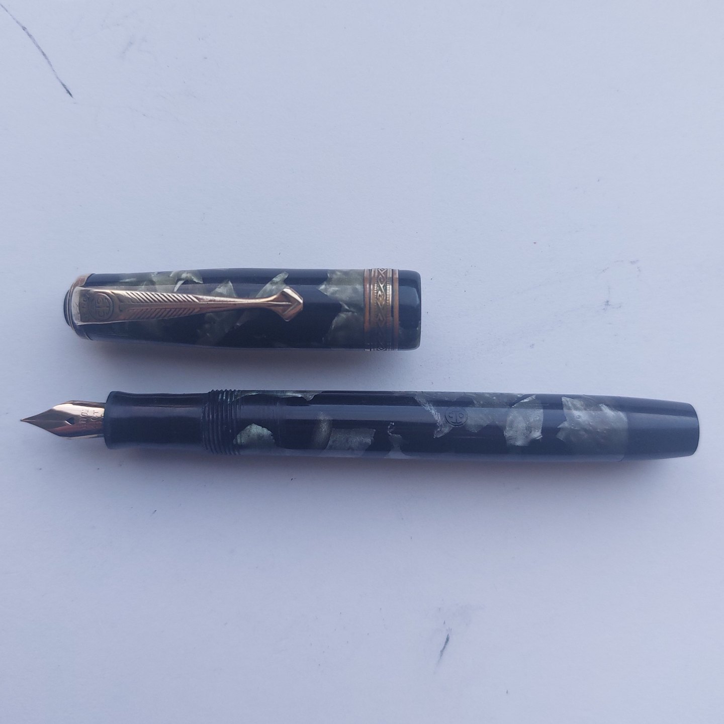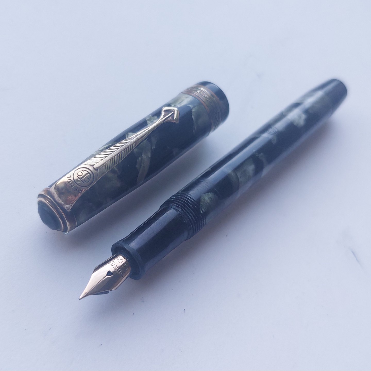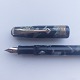 Grøn marmoreret Penol de Luxe (0) fyldepen. Push button blækpåfylder. Virker ikke. Der skal indsættes ny gummisæk før end den igen kan optage blæk og skrive igen. Alle dele originale Penol dele. Der kan indsættes ny gummisæk for kr. 250,-fyldepennen er 11,8 cm lang.