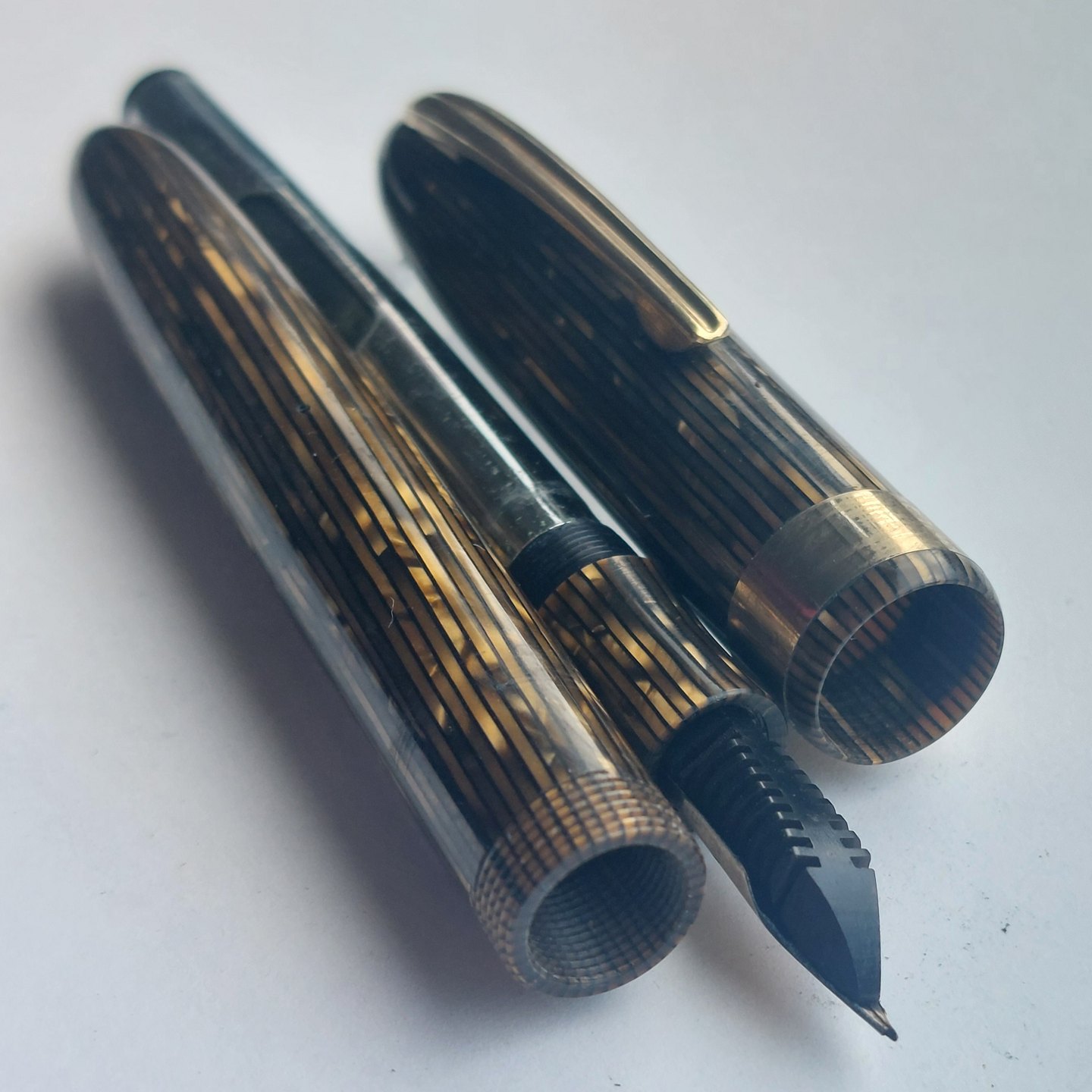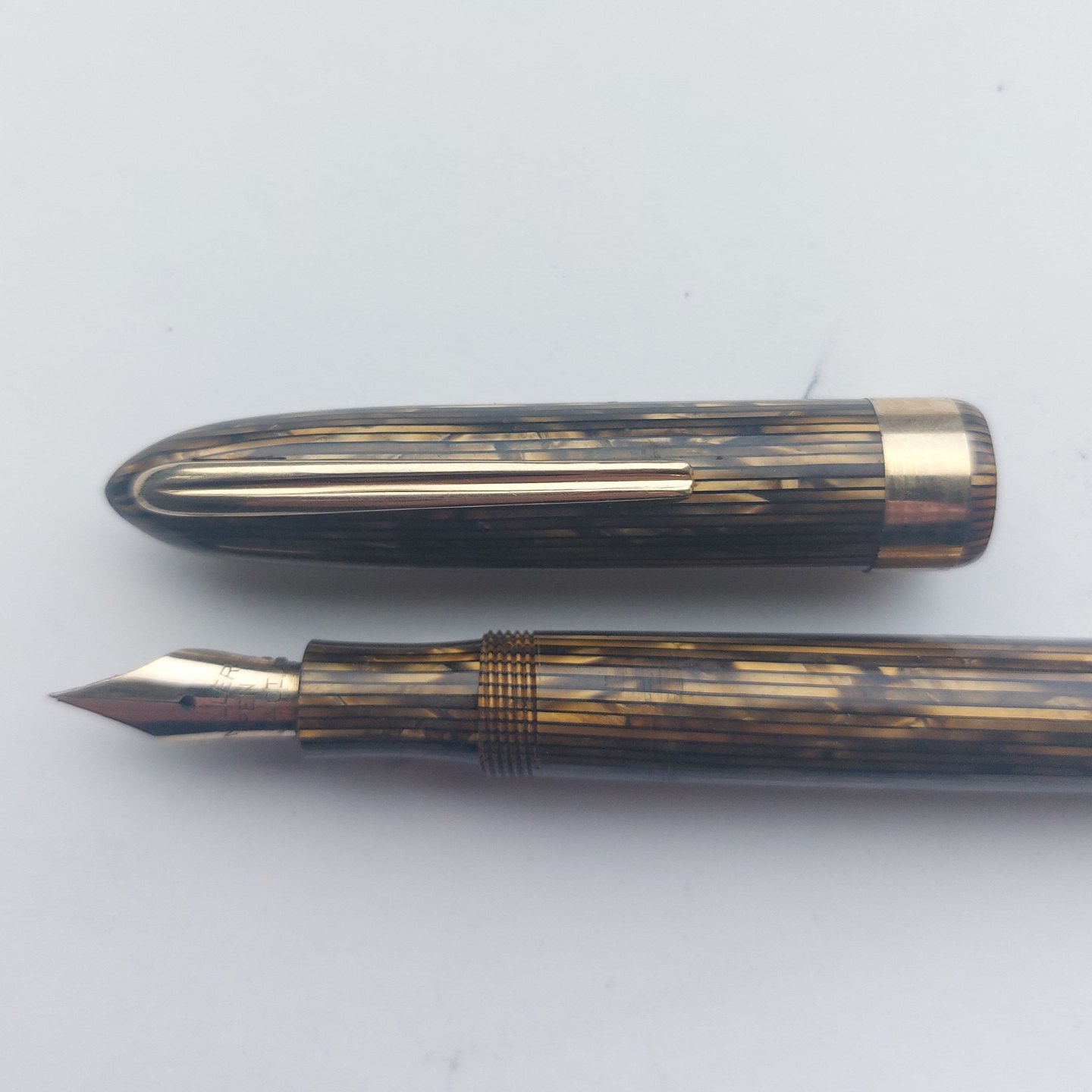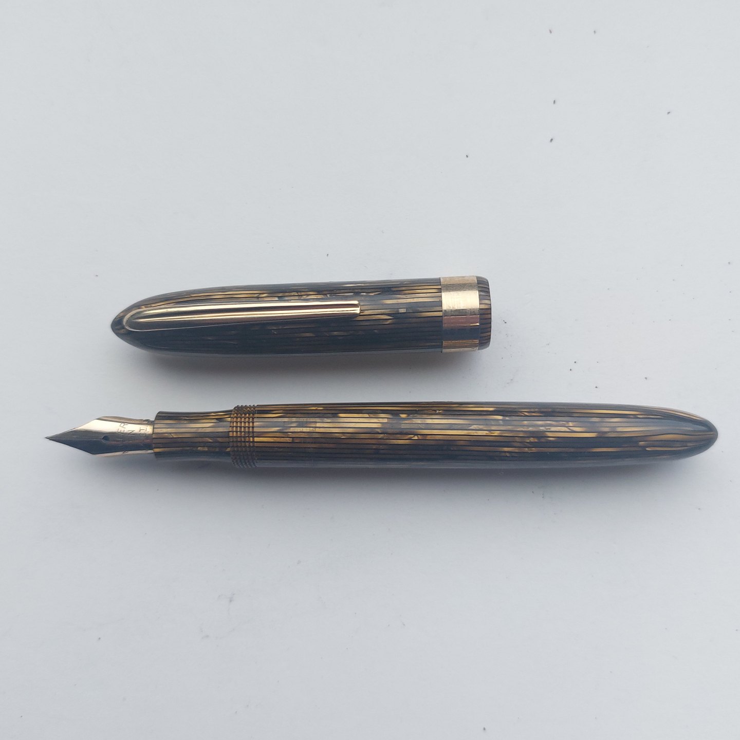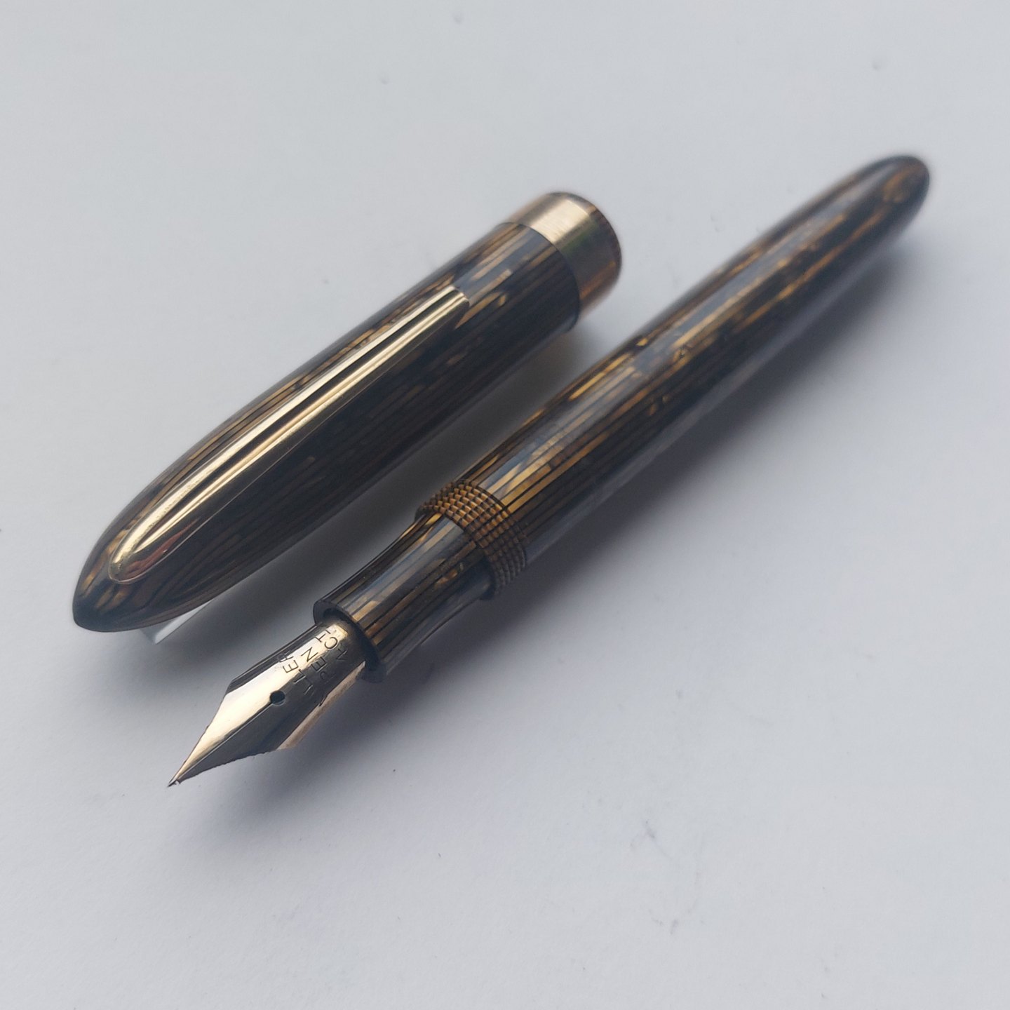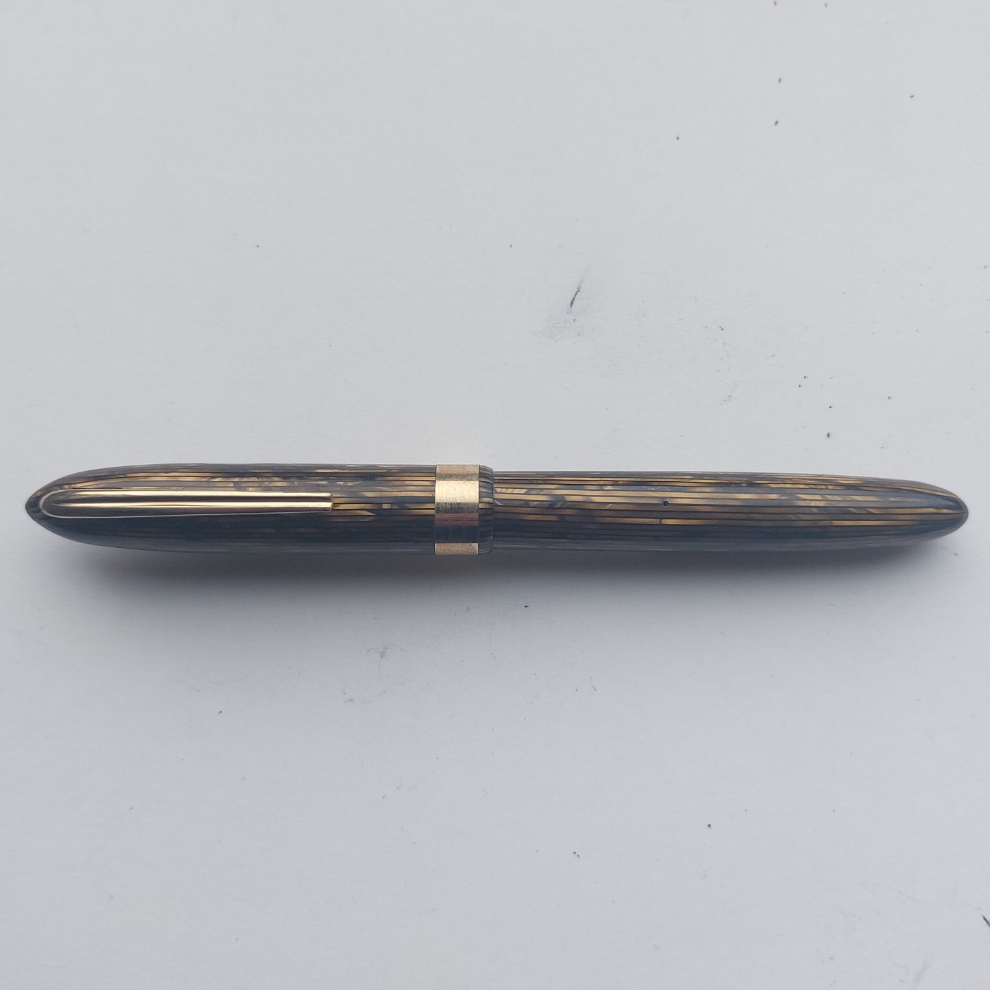 Grøn stribet Miller Streamline nr. 624 fyldepen. Fremstår i god stand. Klar til at blive brugt med gammel gummisæk. Alle dele originale Miller dele inclusiv en 14 karat guldspids.