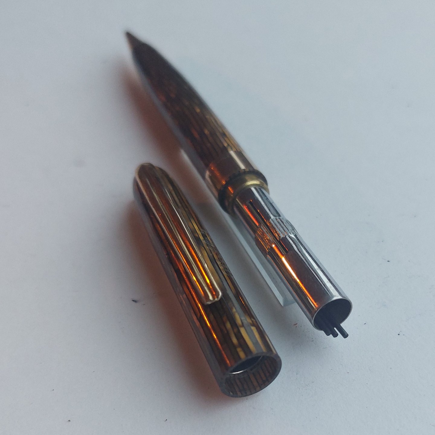 Slank grøn stribet Miller nr..620 skrueblyant. Bredt guld-double bælte på midten. Fremstår I god stand uden skader eller reparationer. Klar til at blive brugt. 12,8 cm.