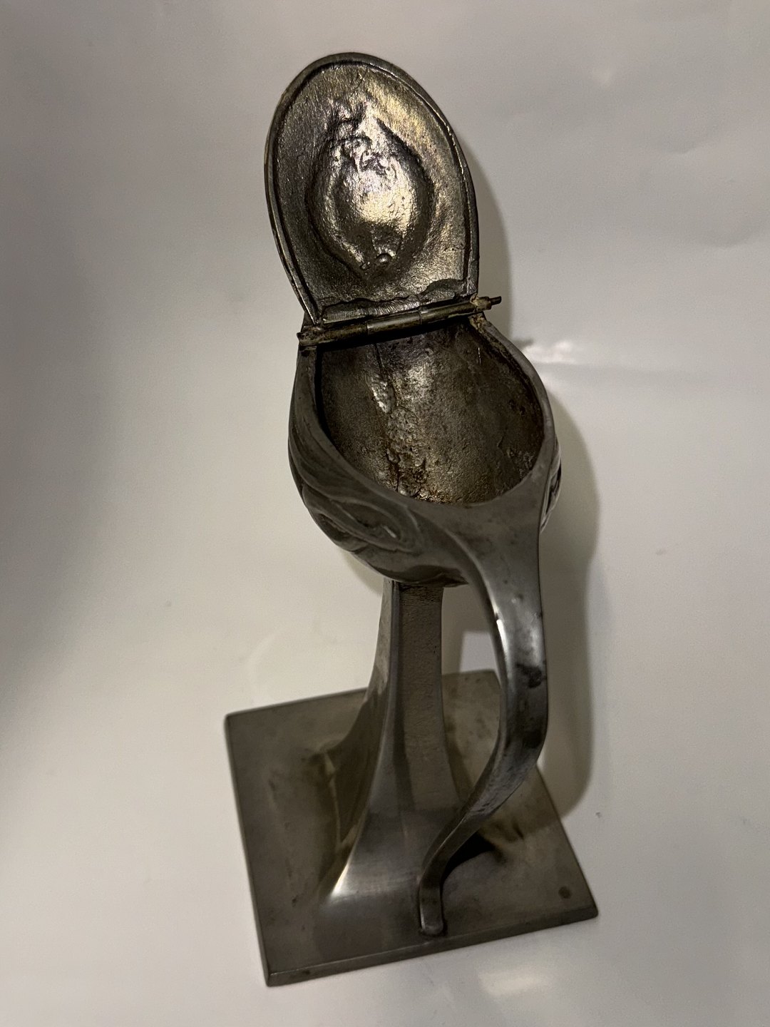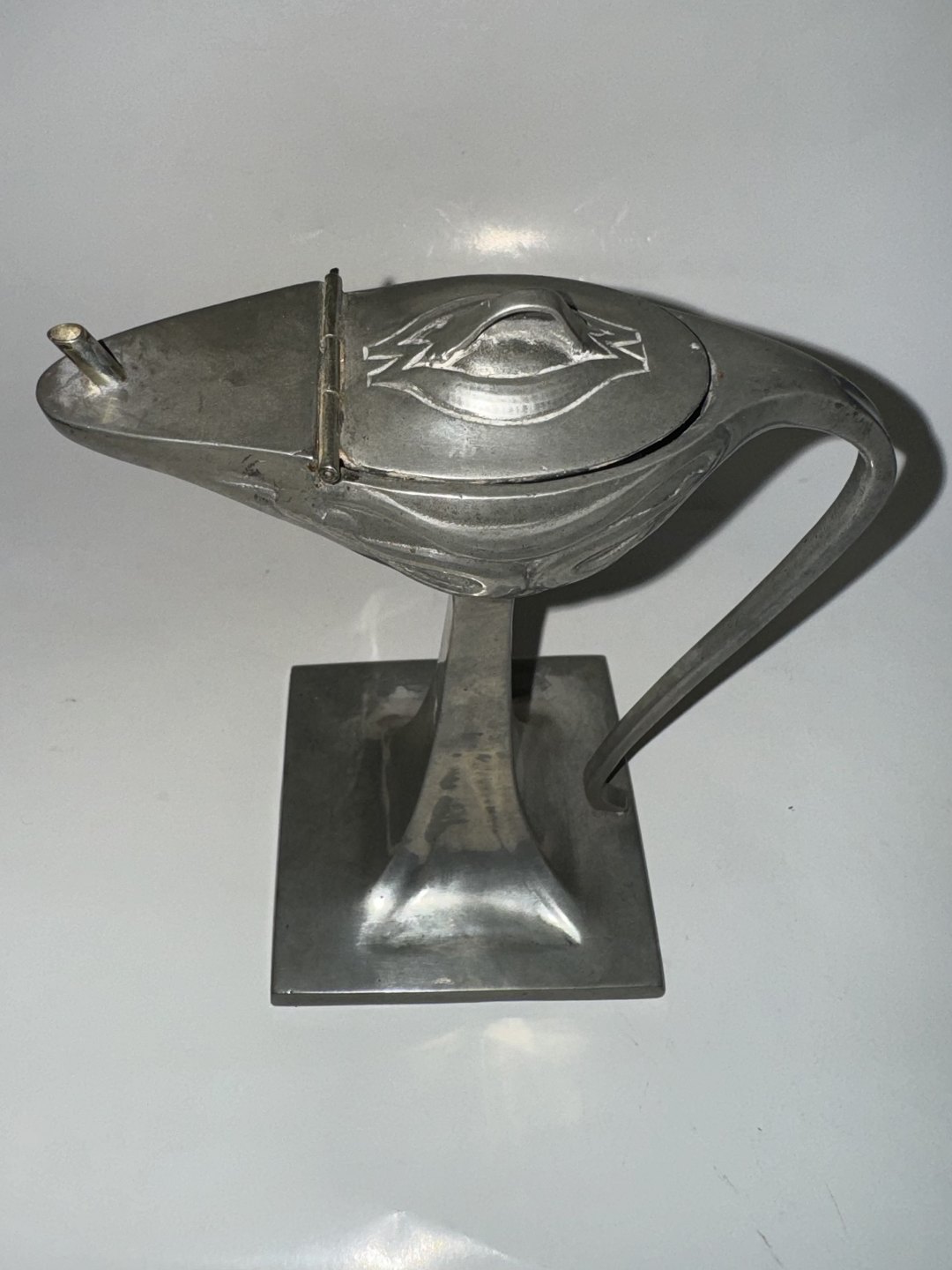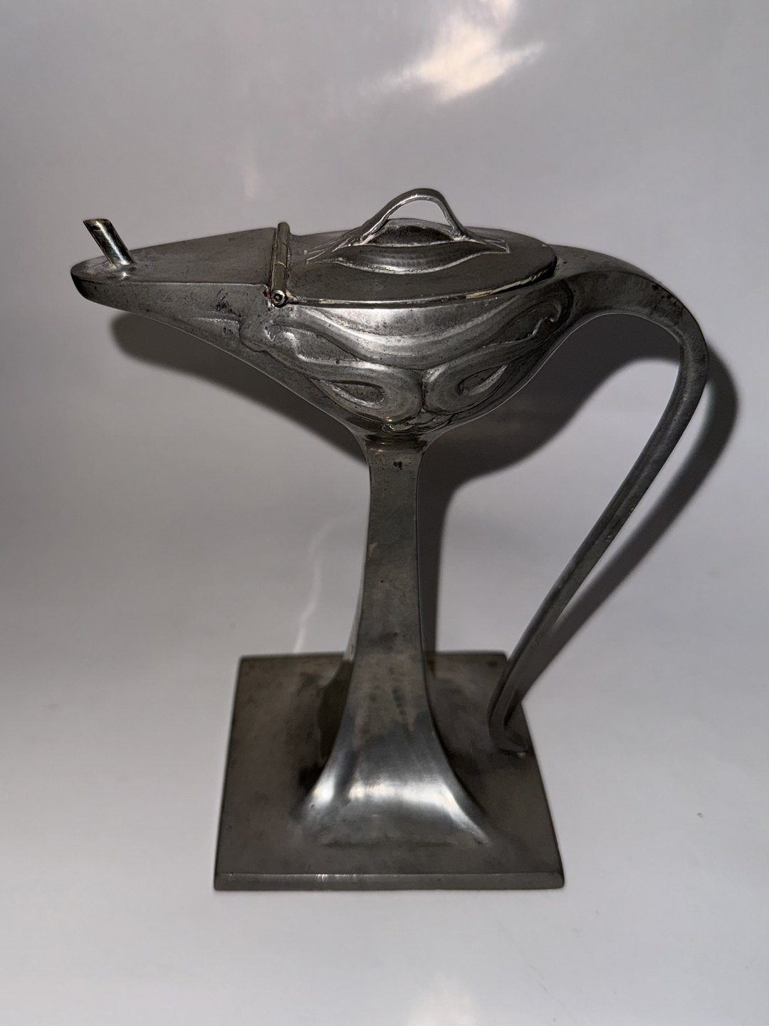 Skønvirkestil: Olielampe i tin. Fremstillet hos Mogens Ballin’s efterfølger Hans Peter Hertz (HPH) omkring 1920. Fremstår i god stand uden skader eller reparationer. Fabriksmærket på bunden med HPH. Mål: H. 15,5 cm.