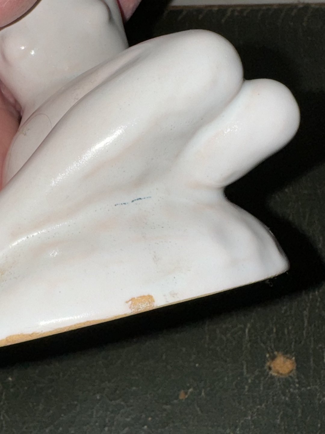 Hvid glaseret figur i keramik fra L. Hjorth fabrikken på Bornholm. Fremstillet af Gertrud Kudielka. Fremstår i god stand uden skader eller reparationer. Har dog en lille spot på forsiden - En lille plet af manglende glasur. Kumstnersignatur GK samt fabriksmærket på bunden. H. 16 cm
