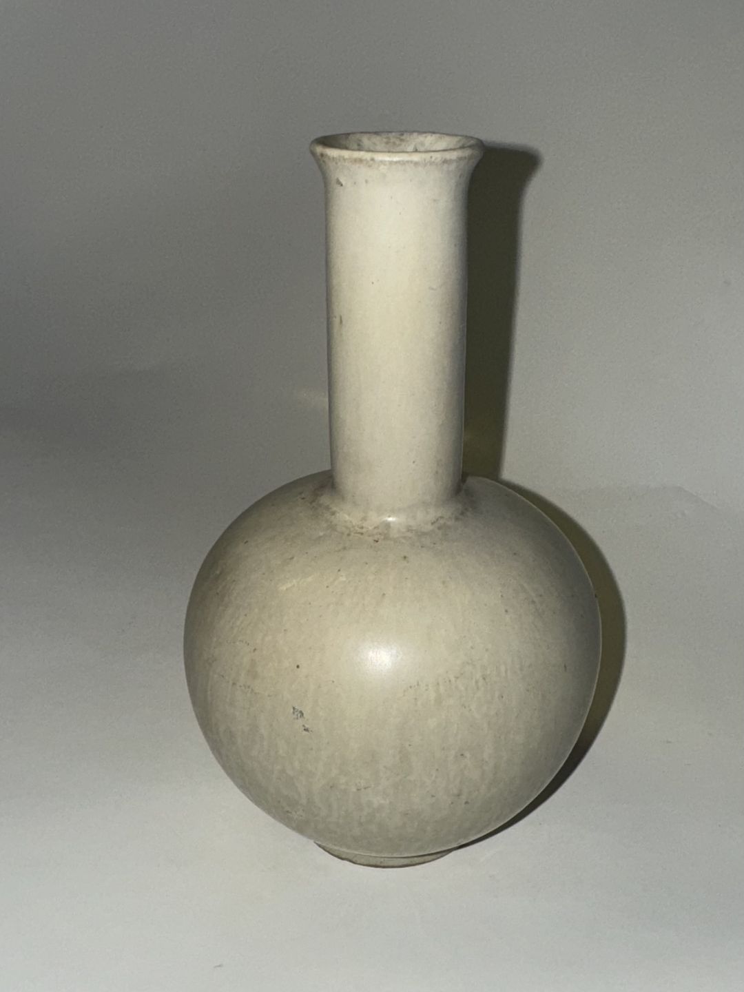 Vase i keramik fra Arne Bang. Rund krop og lang hals. Dækket af en lys creme glasur. I fin stand. Fabriksmærket med kunstner-monogram på bunden. H. 15,5 cm.