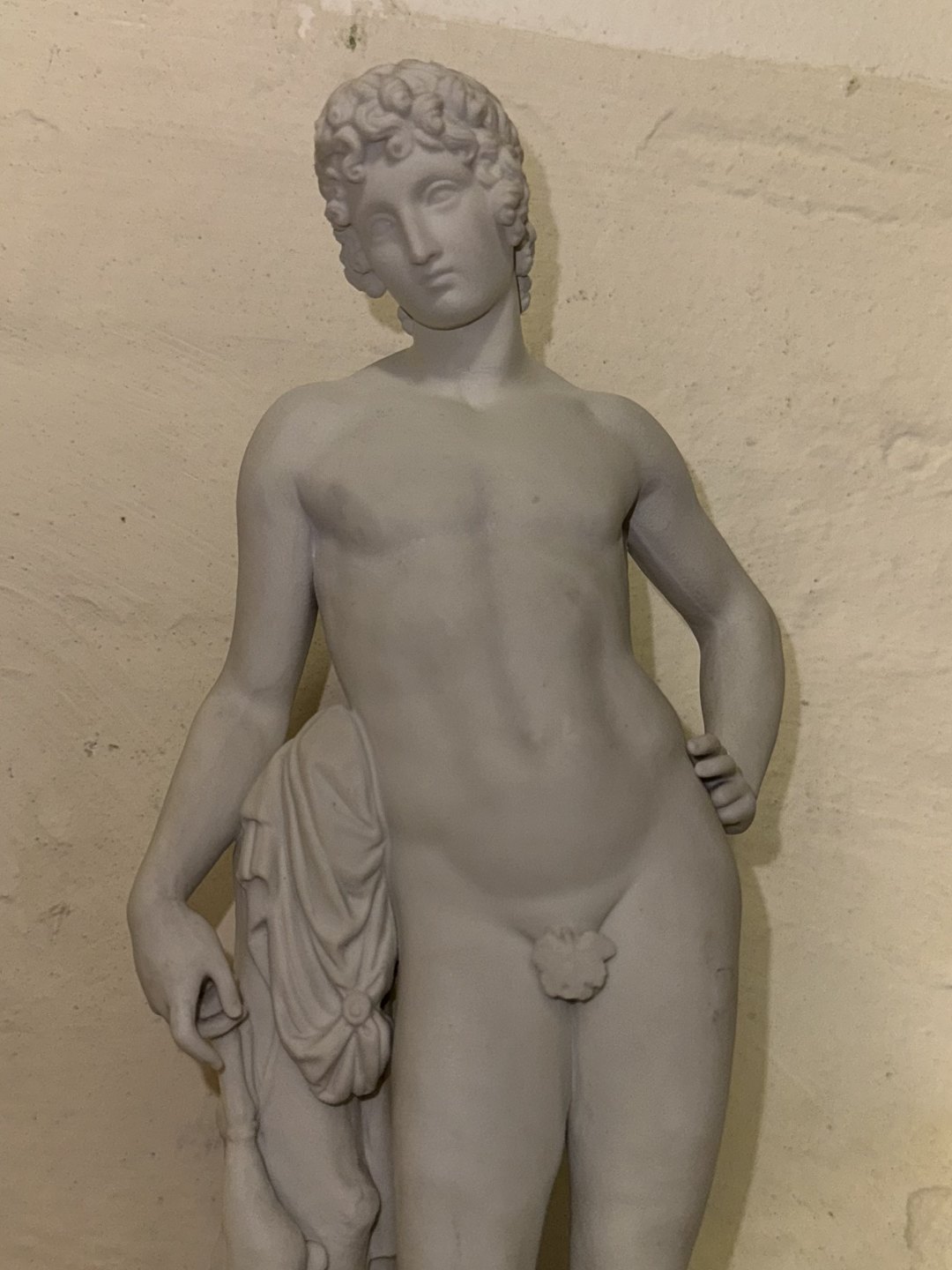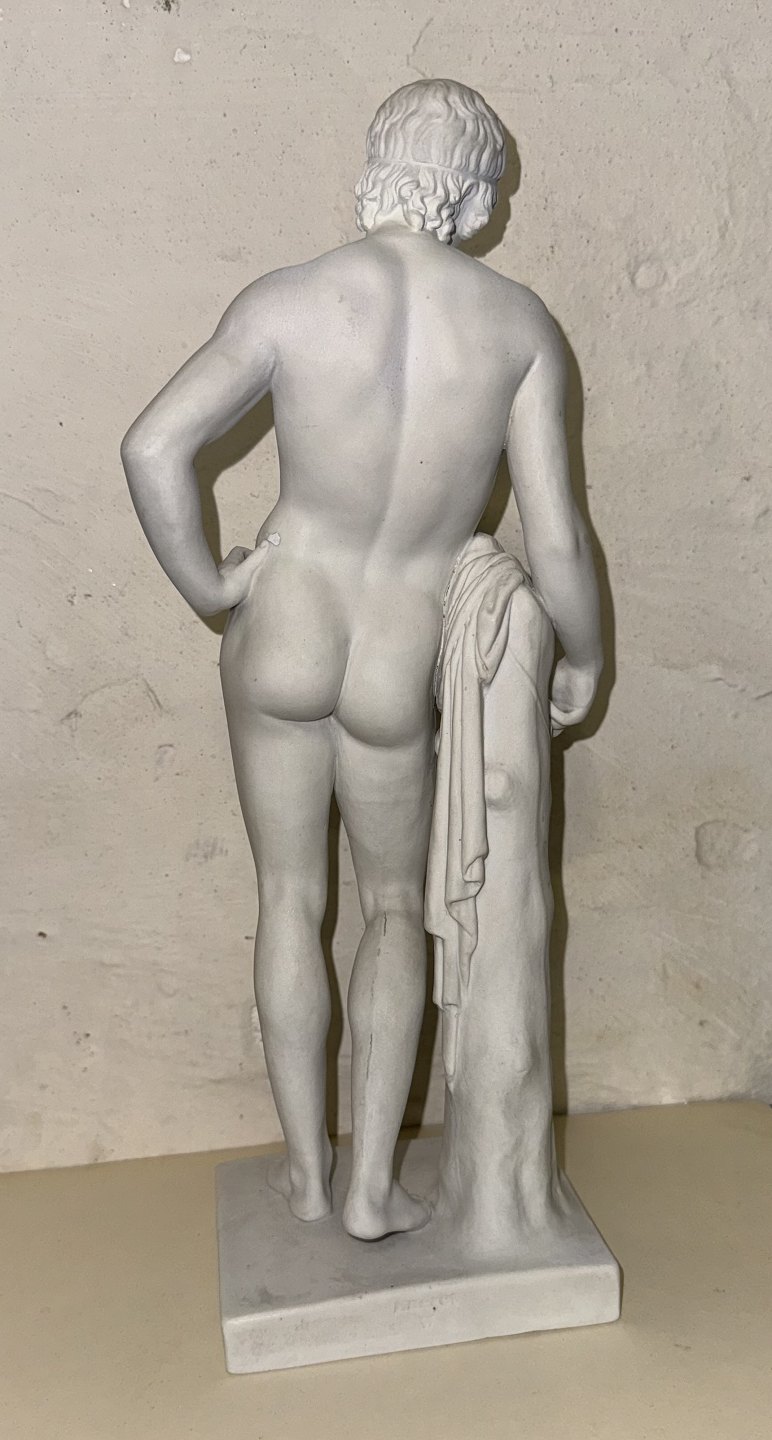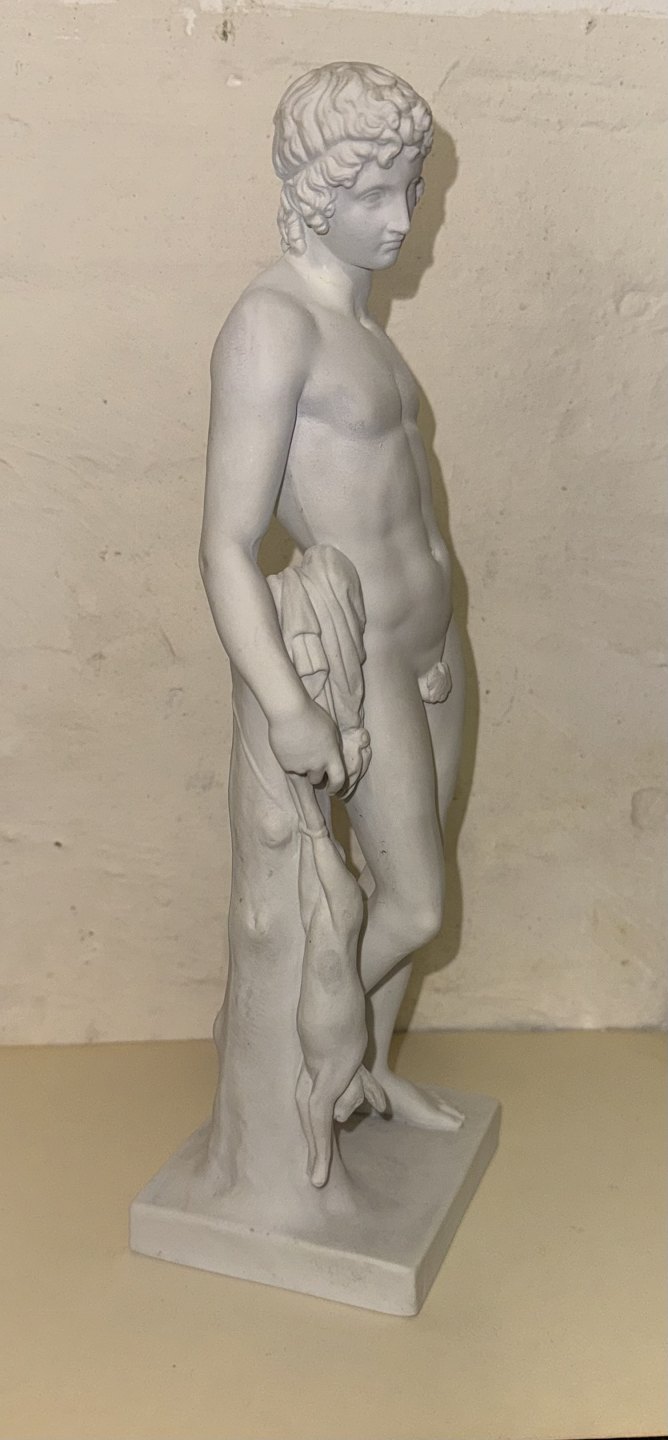 Figure in bisquit porcelain by Adonis. After statue modeled by Bertel Thorvaldsen (1770-1844) in Rome in 1808. Made at Royal Copenhagen in the late 19th century. Minor repair on the hare's ear. The factory mark on the bottom. H. 32 cm