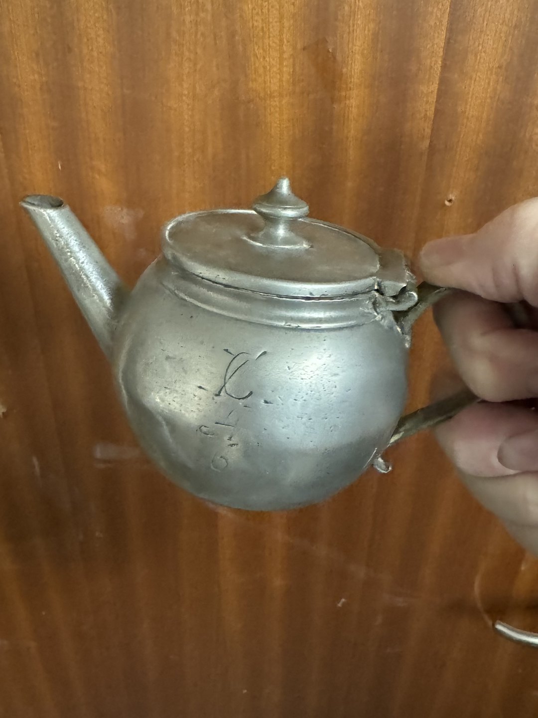 Lille tepotte i tin. Fremstillet i Tyskland i første halvdel af 19. århundrede. I god stand. Stemplet på bunden. Mål: H. 9,5 cm L. 16 cm