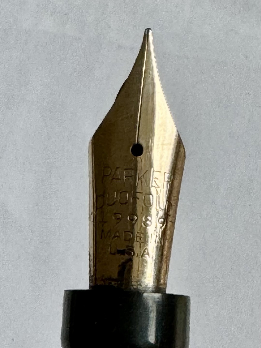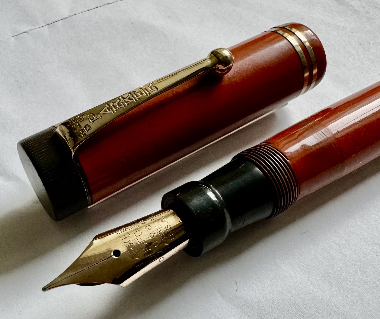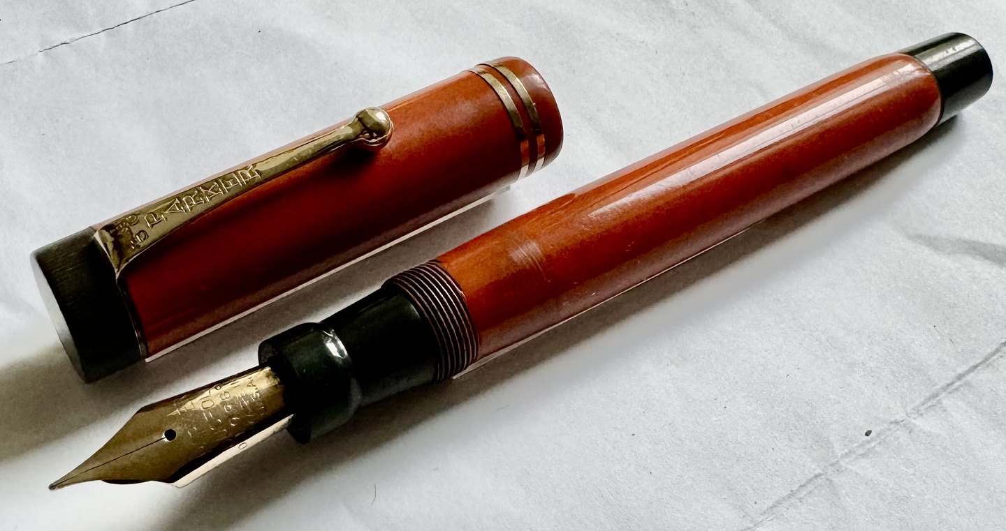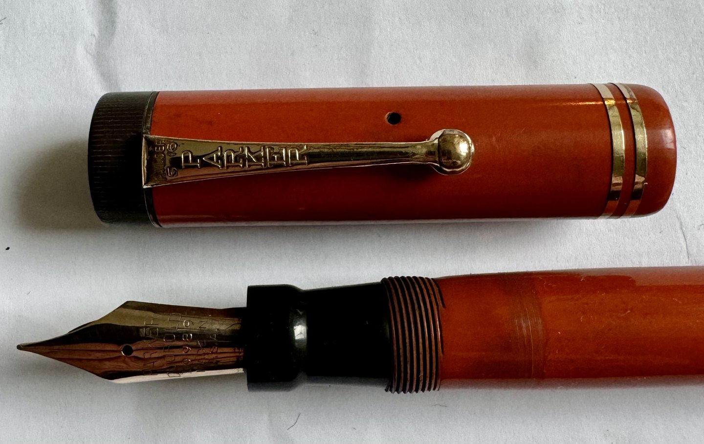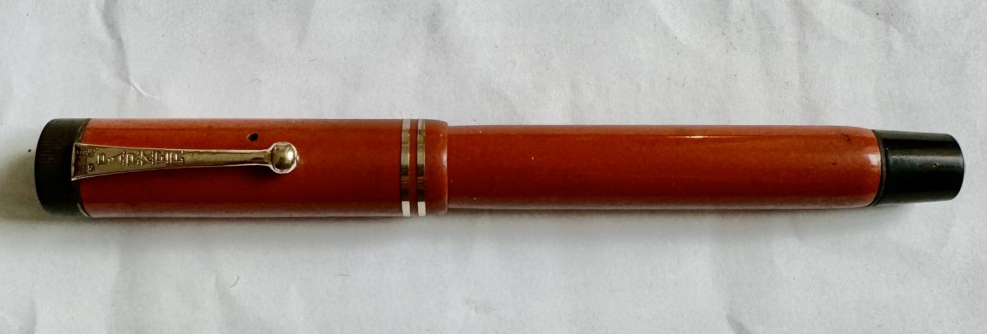 Large coral red Parker Duofold fountain pen from the 1930s. Made in the U.S.A. Appears to be in good condition with no damage or repairs. All parts original Parker including a large Parker Duofold 14 carat gold tip. A new rubber bag must be inserted before it will work again. New rubber bag can be inserted for an additional DKK 250,- The fountain pen is 14 cm long