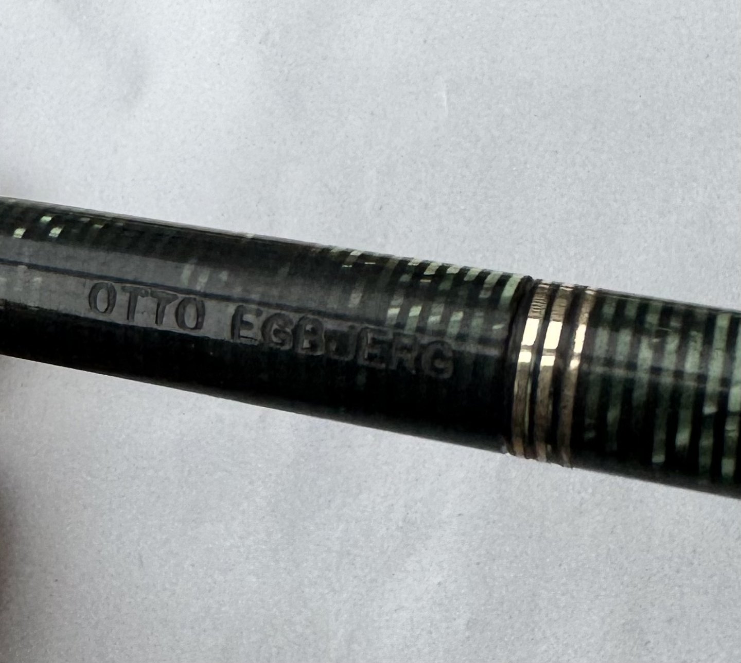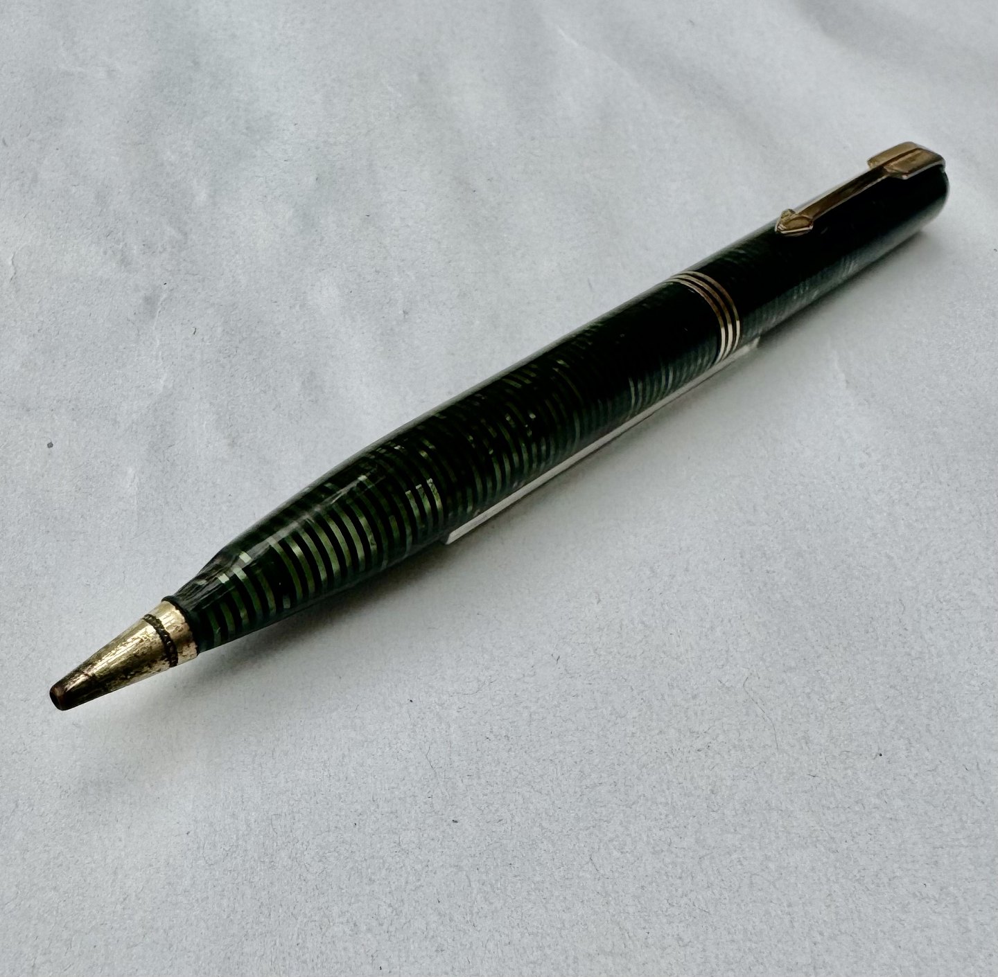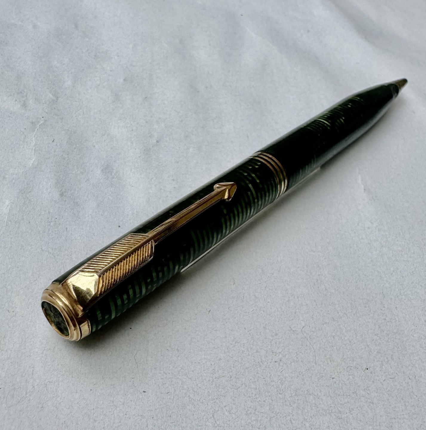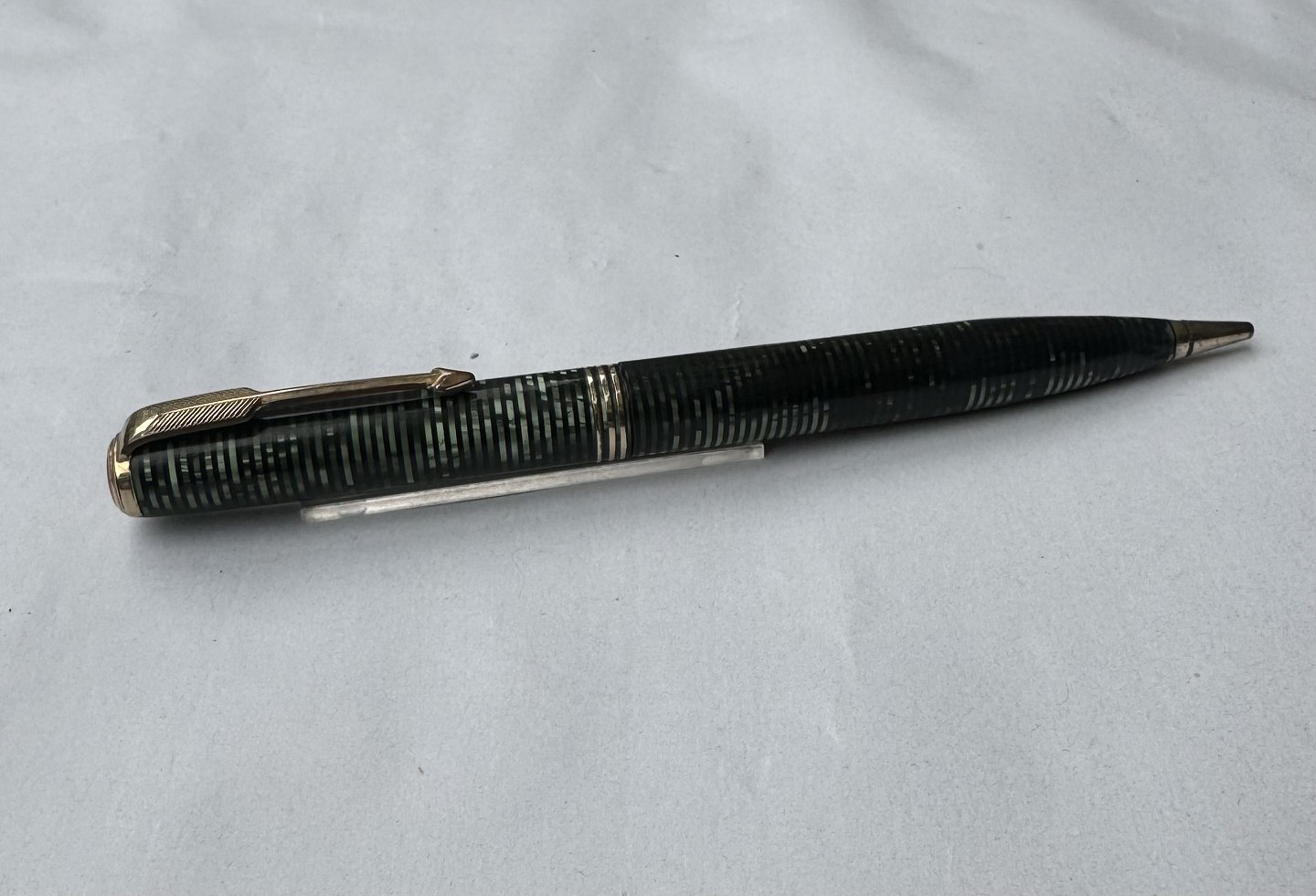 Grønstribet Parker Vacumatic skrueblyant I fin stand. Alle dele originale. Ingen skader eller reparationer. Indgraveret personligt navn. Klar til at blive brugt. L. 13 cm