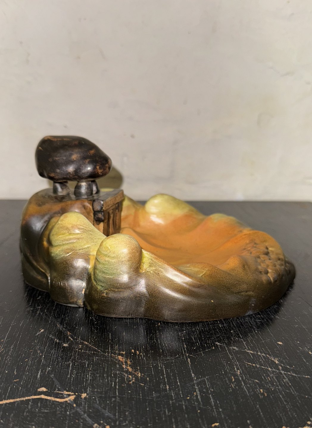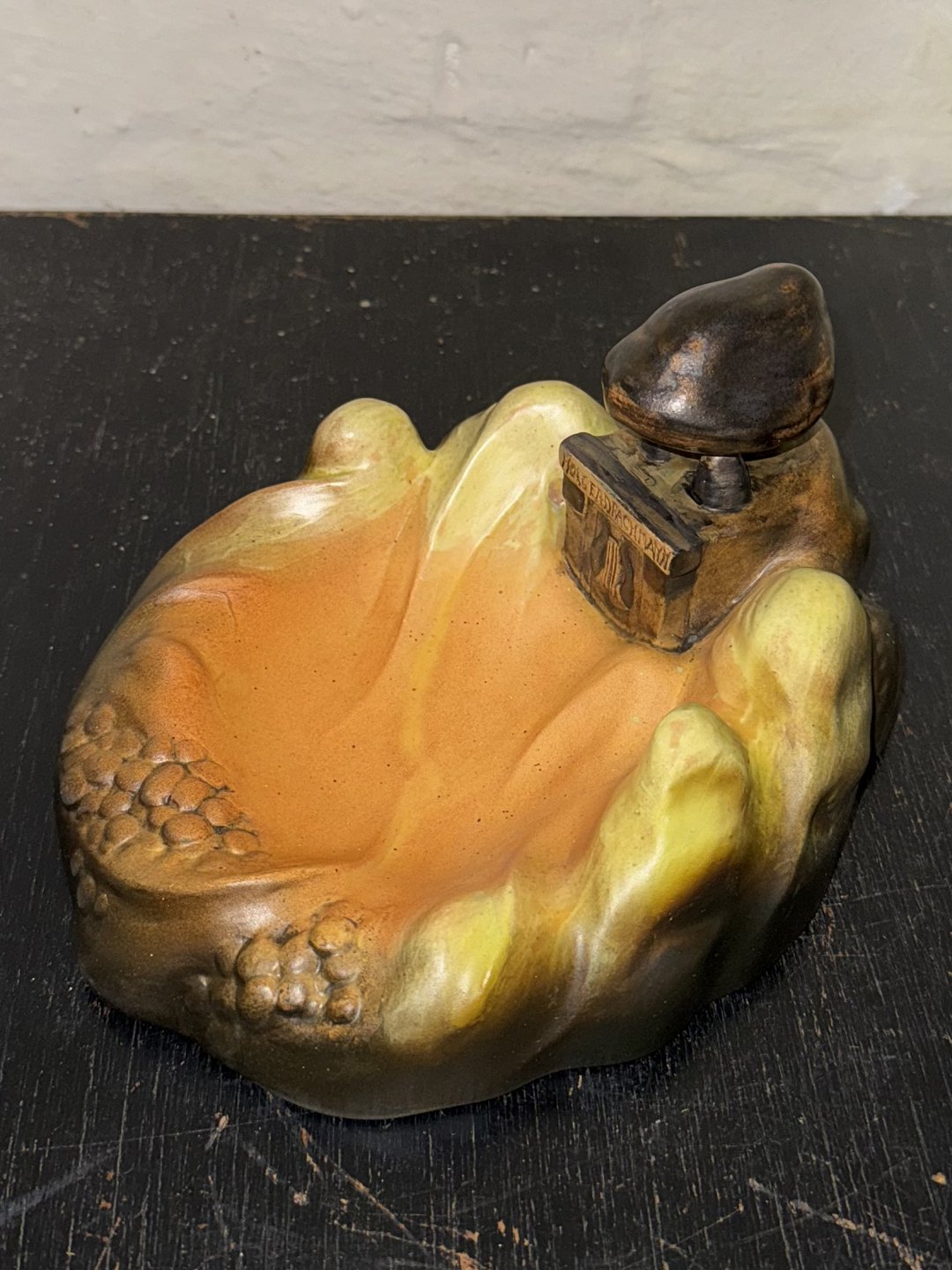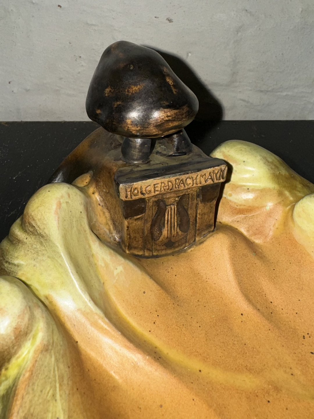 Cigar askebæger fra P. Ipsens Enke, København. For enden en model af Holger Drachmann’s gravsted/monument, der kan ses ved Grenen i Skagen. Udover monumentet ses fine dekorationer i skønvirkestil. Et meget usædvanligt og sjældent emne fra denne fabrik. Fremstår i god stand. Mål: H. 9,4 cm L. 20,2 cm B. 15,4 cm.