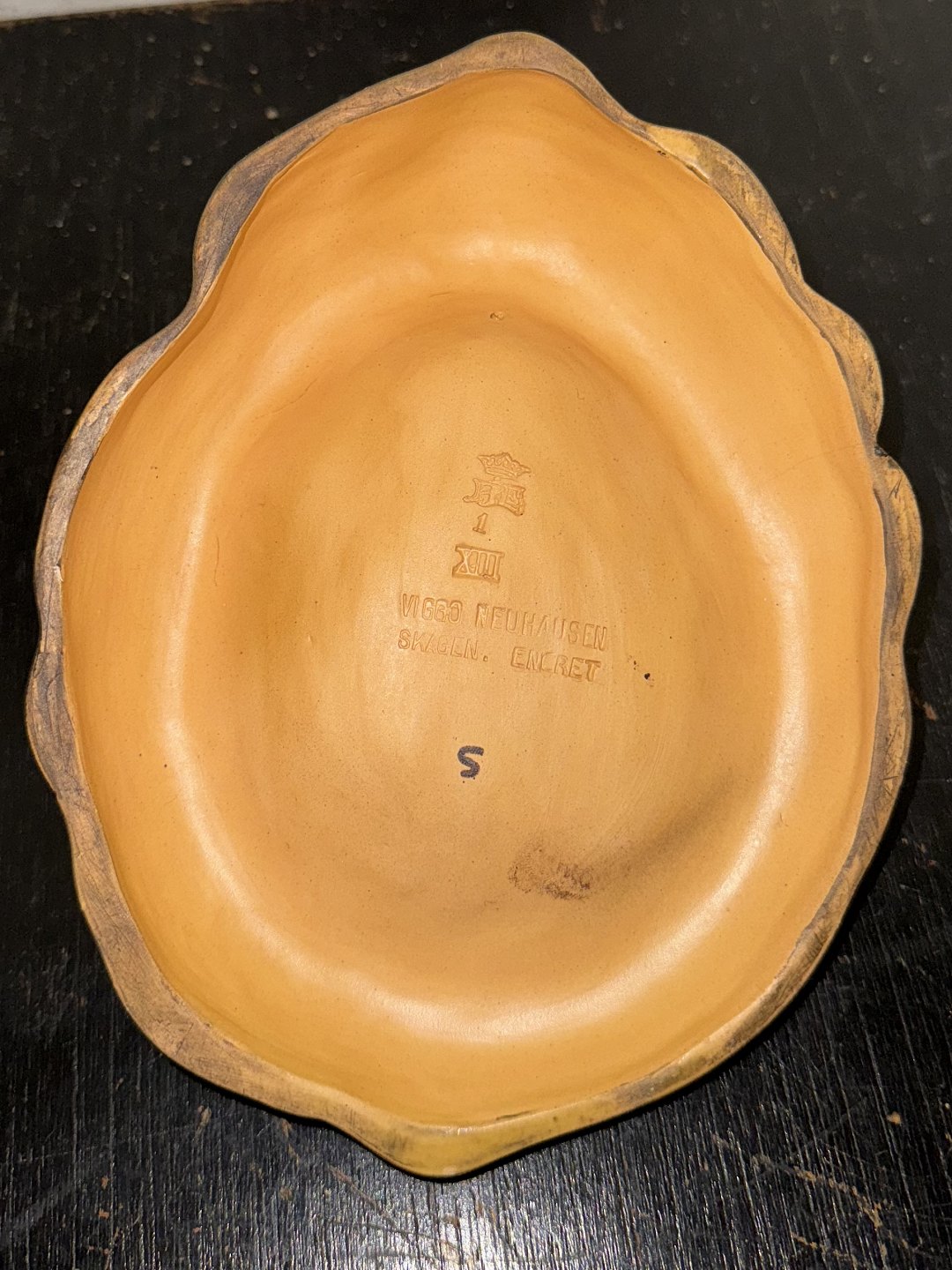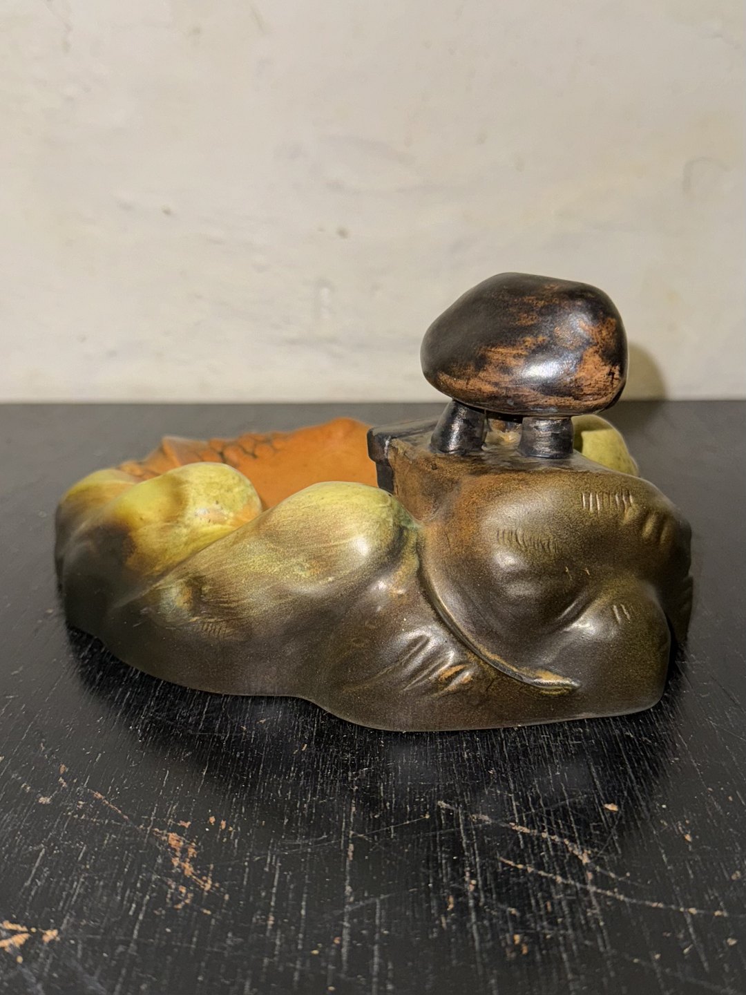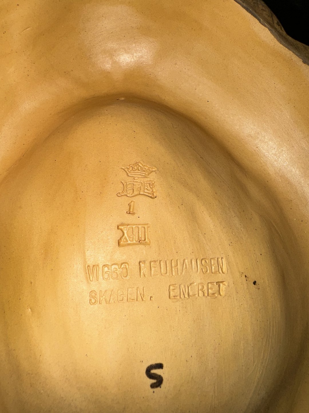 Cigar askebæger fra P. Ipsens Enke, København. For enden en model af Holger Drachmann’s gravsted/monument, der kan ses ved Grenen i Skagen. Udover monumentet ses fine dekorationer i skønvirkestil. Et meget usædvanligt og sjældent emne fra denne fabrik. Fremstår i god stand. Mål: H. 9,4 cm L. 20,2 cm B. 15,4 cm.