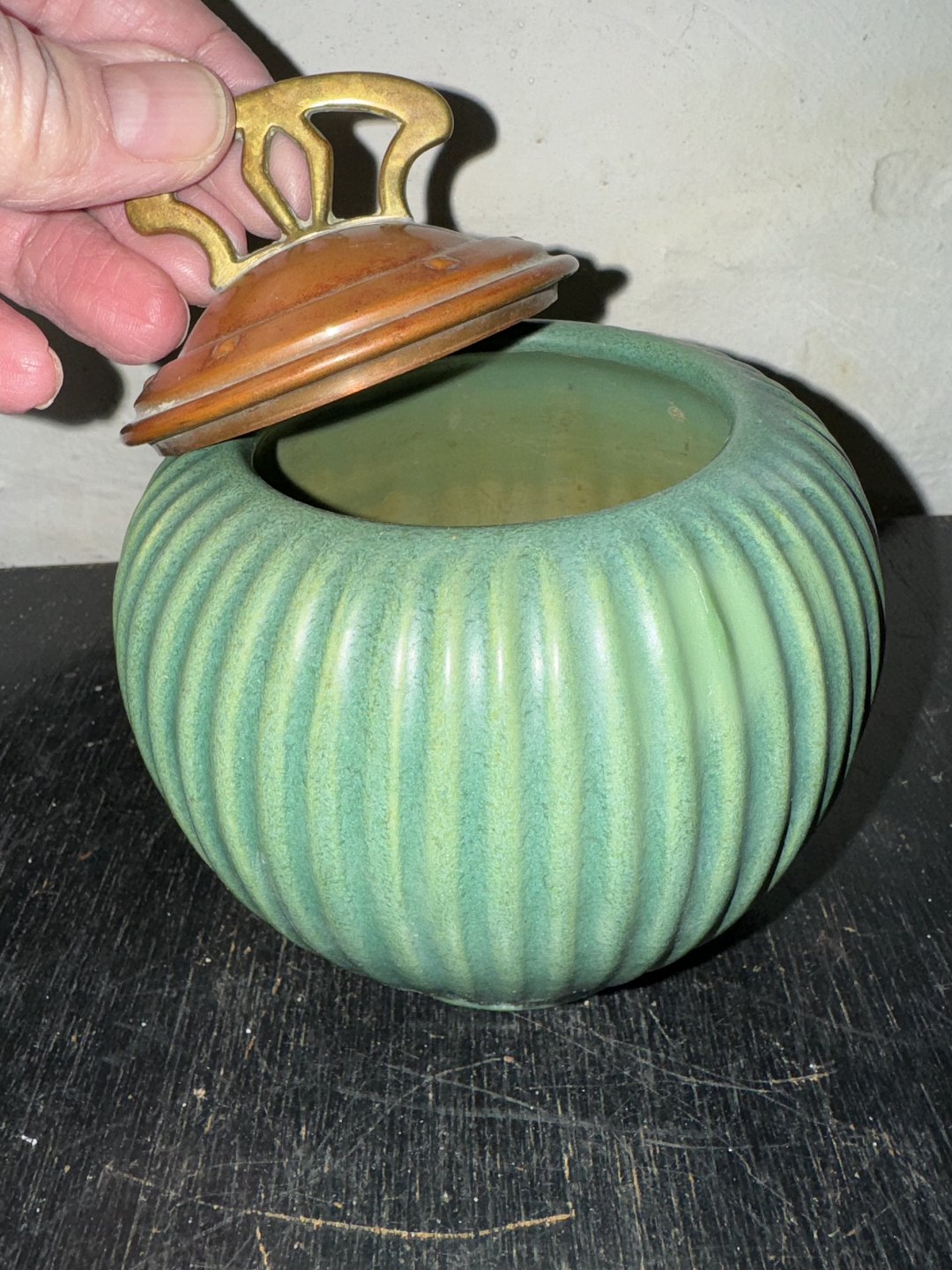 Grøn krukke med riller i keramik fra Michael Andersen & Søn. På toppen af krukken et låg i metal. Begge dele i god stand. Krukken fabriksmærket på bunden med det velkendte logo . Rønne’s byvåben. Mål: H. 14,3 cm incl. låg