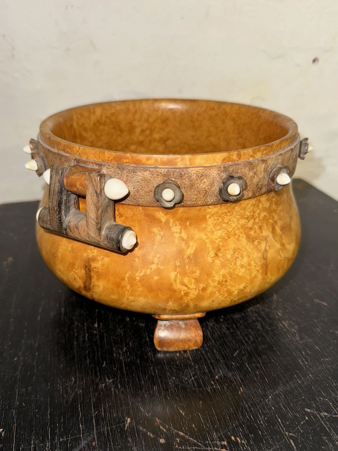Skål på tre ben i Masur Birk. Formodes fremstillet i Norge i 19. århundrede. Dekoreret med hank samt med ben-perler som blomster rund i kanten. Flere dog forsvundet. Alderrelateret brugsspor. Bl.a. revner i bunden af skålen. Har sikkert været et kært brugsobjekt i generationer. Mål:H. 12,3 cm Ø. 16,5 cm