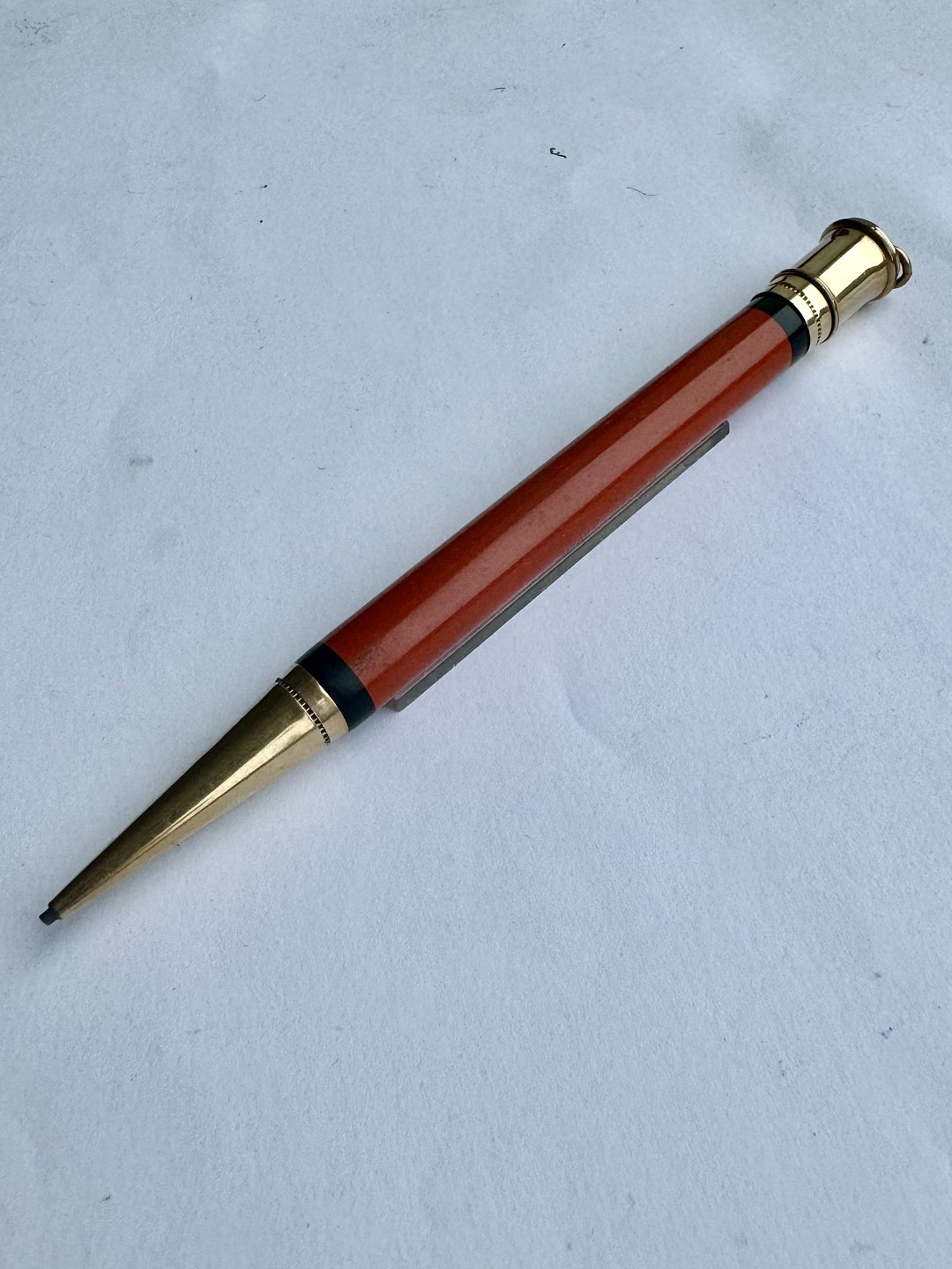 Koralrød Parker Duofold skrueblyant fra 1930’erne. Messing top med øsken. Fremstår i god stand. Klar til at blive brugt. L. 11,5 cm