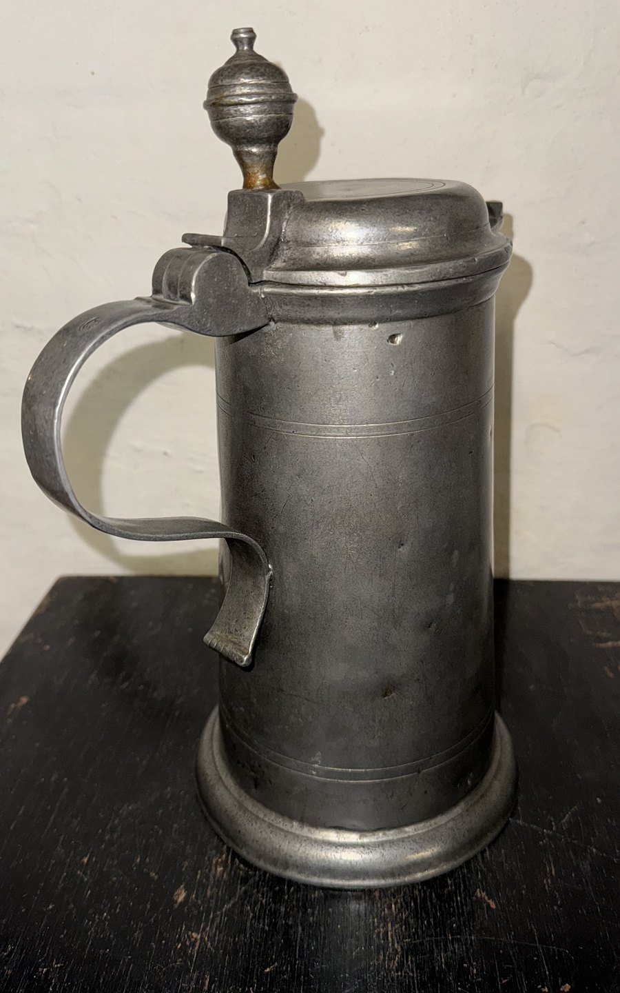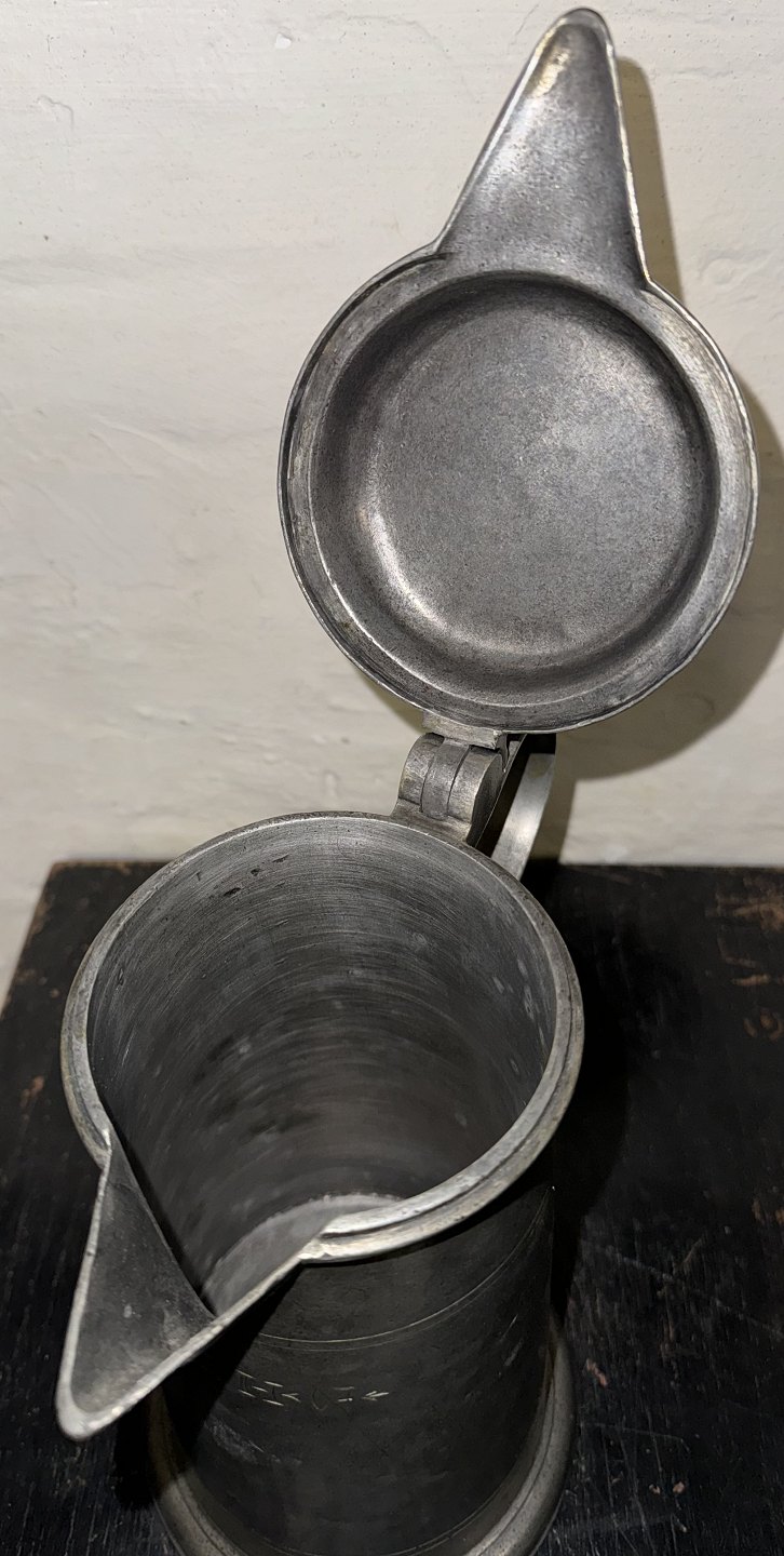 Større kande med låg i tin. Stemplet med tyske mærker på hanken samt på bunden. Indgravering på forsiden med 17EH67. Fremstår i god stand. H. 30 cm. Bundens diameter er 15,5 cm