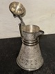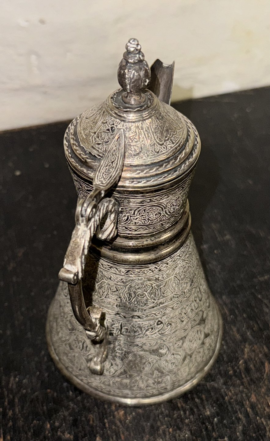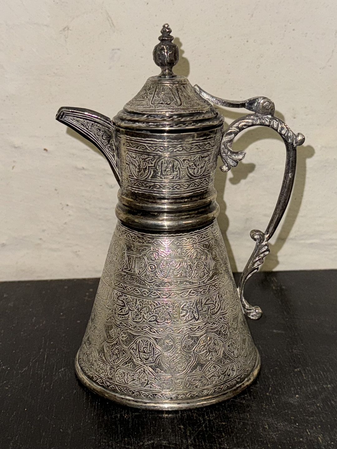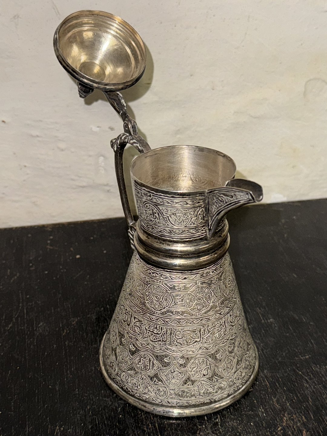 Mellemøstlig kande i sølv. Dekoreret overalt undtaget på bunden, hvor der ses et sølvstempel. Fremstår i god stand. Ingen skader eller reparationer. Vægt: 255 gram. H. 17 cm Bundens diameter er 9,3 cm.