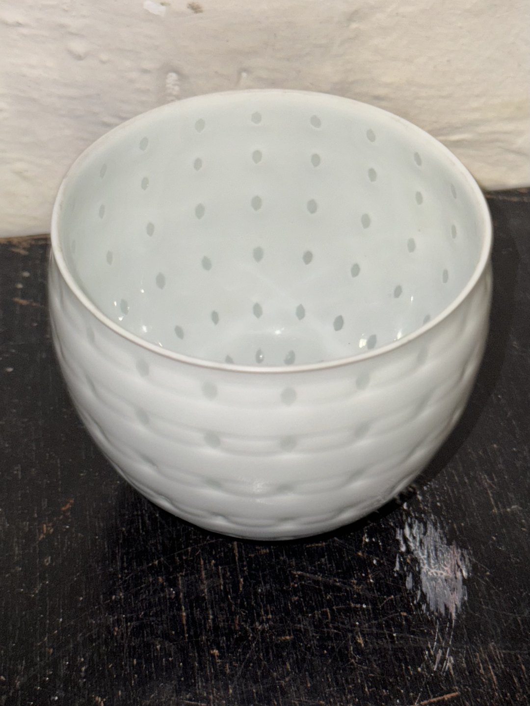 Skål eller bæger. i Blanc-de-Chile porcelæn fra Bing & Grøndahl. Designet af Lisbeth Munch-Petersen (1909-1997). Fremstår i perfekt stand. 1. sortering. Ingen skader eller reparationer. Mål: Vasen er 9,5 cm høj og åbningsdiameter på 10,2 cm. På bunden stemplet med fabriksmærke og logo - ovenover kunstnersignatur LM-P
