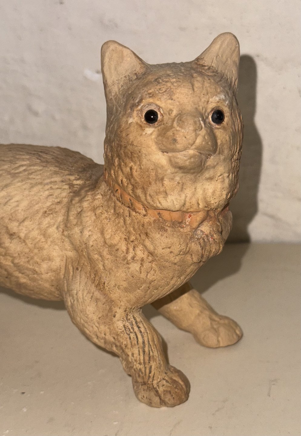 Figur af stående kat i terracotta keramik med glasøjne. Fremstillet i 19. århundrede. I god stand. Intet fabriksmærke. Mål: H. 11 cm L. 14,5 cm