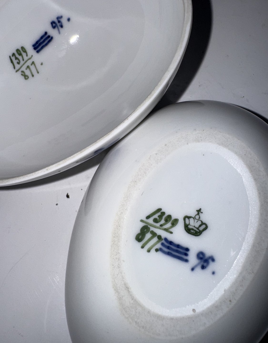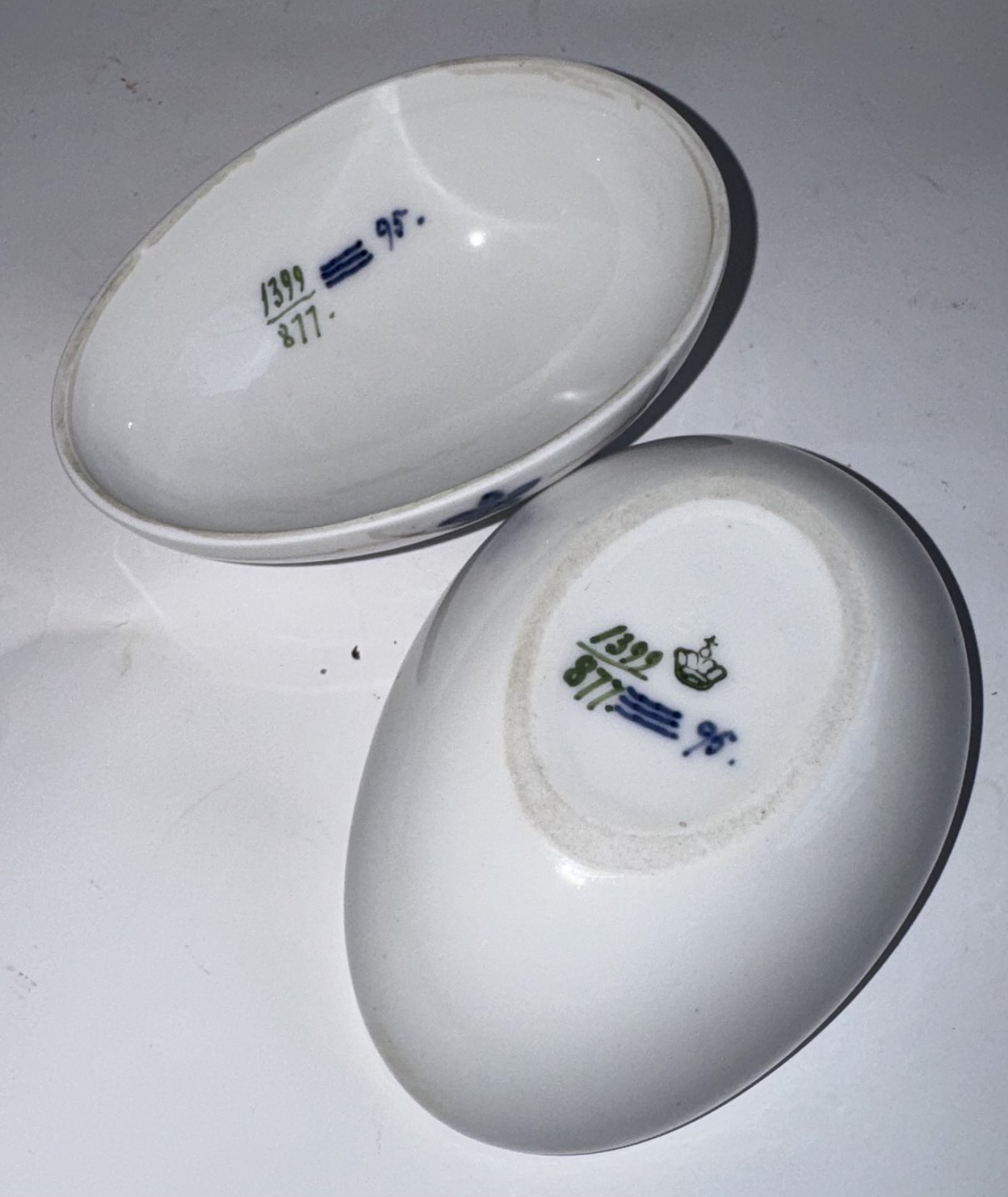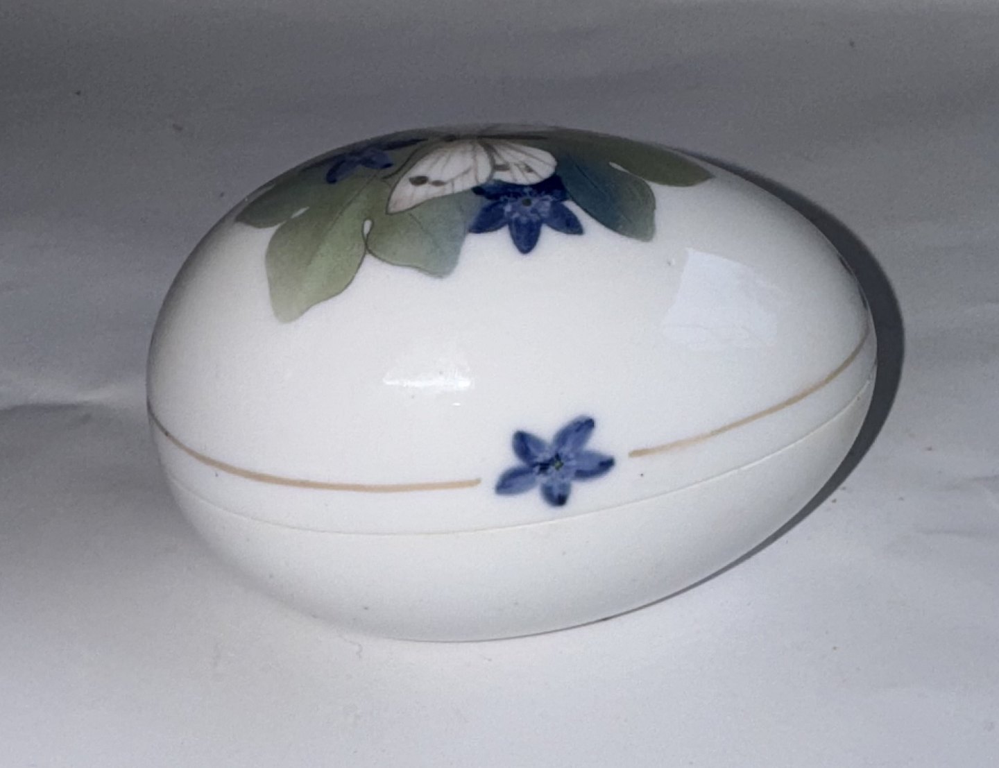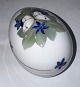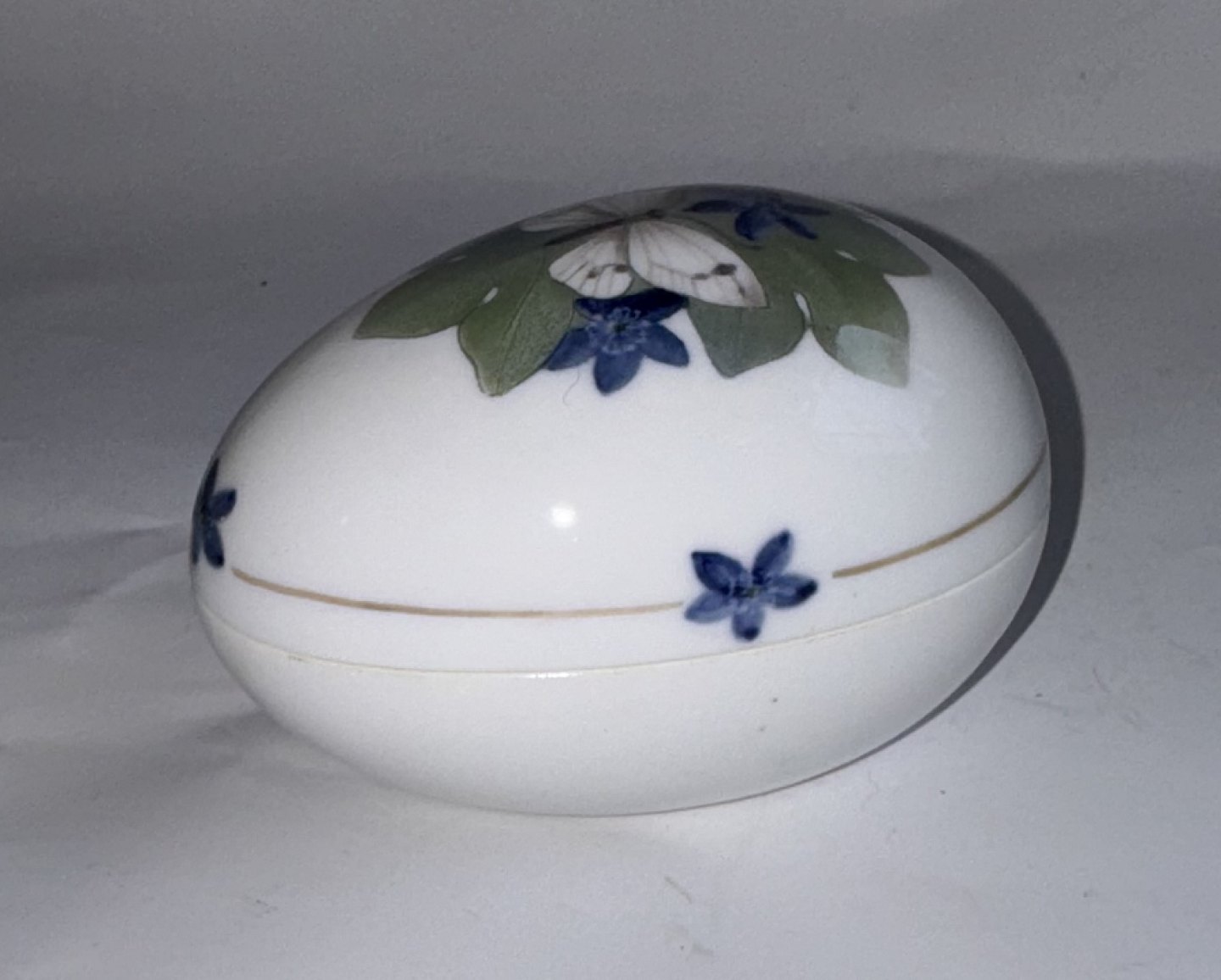 Two-part egg in porcelain, bottom and lid, from Royal Copenhagen. Decorated with a butterfly and flowers. Factory first quality. In good condition. Both parts factory marked with factory logo and model number 1399/877. Manufactured around 1920. Dimensions: H. 7.2 cm, W. 7 cm L. 10 cm.
