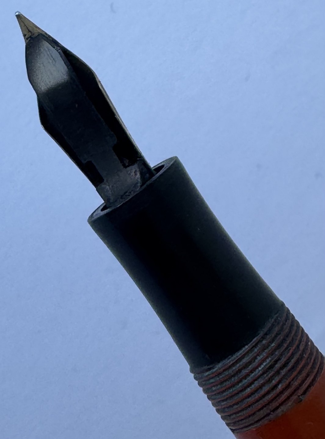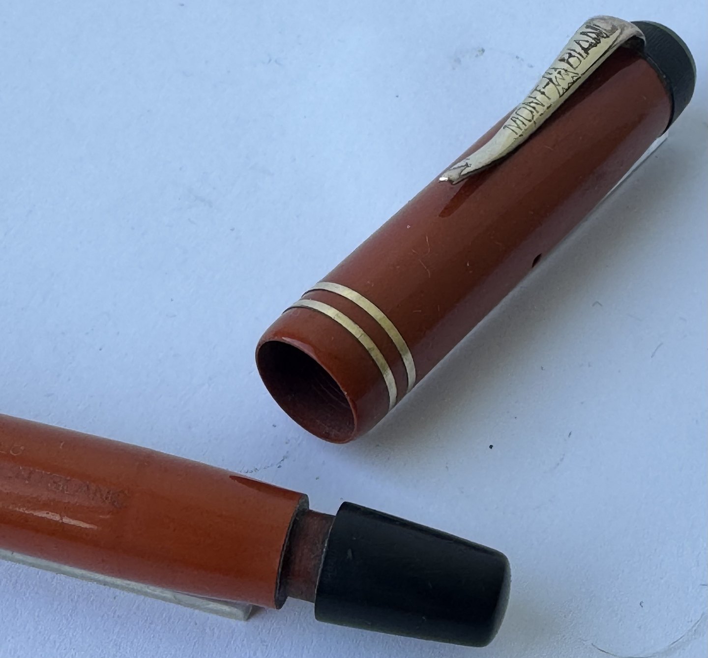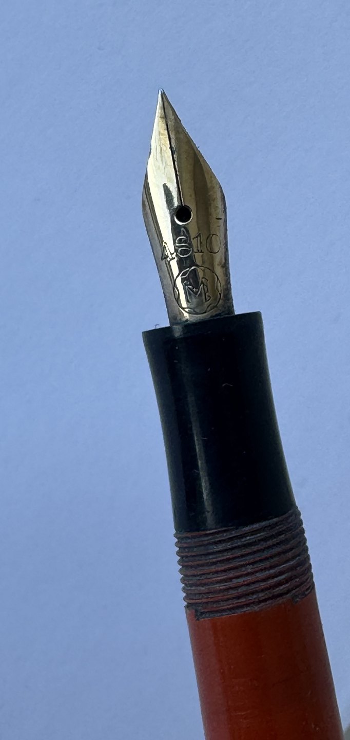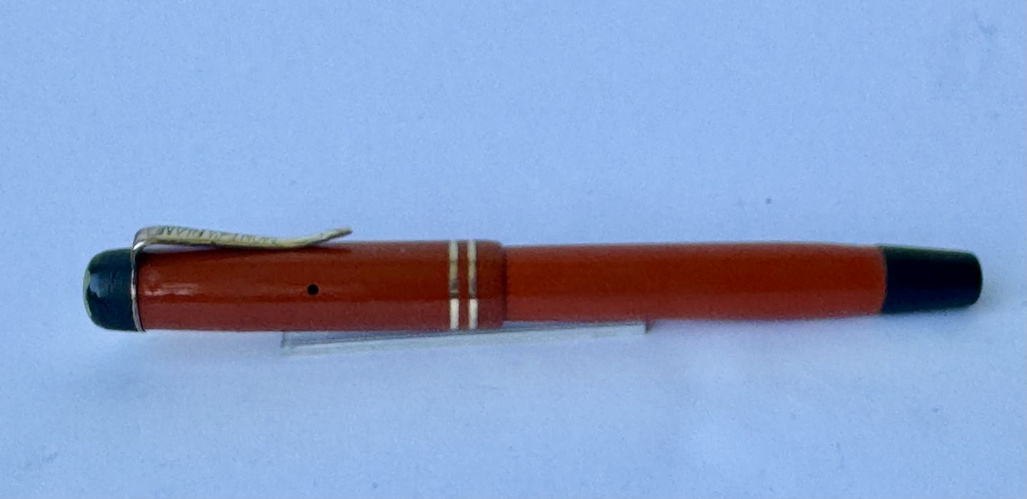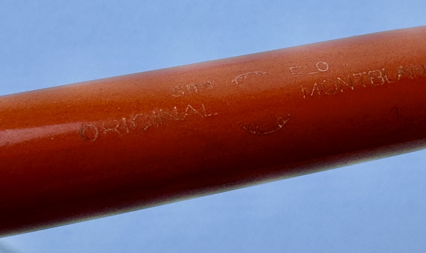 Koralrød Montblanc Simplo nr. 20 fyldepen. Push button filler. Produceret i 1930’erne i Danmark. Let udvisket fabrikslogo på “kroppen”. Enden på clip’en er knækket. Ellers ingen skader eller reparationer. Alle dele er originale Montblanc fra perioden inclusiv den flotte 14 karat guld spids. Fyldepennen fungerer ikke. Ved ekstra betaling på d.kr. 250,00 indsættes ny gummisæk, så den igen bliver funktionsduelig. Mål: L. 13 cm