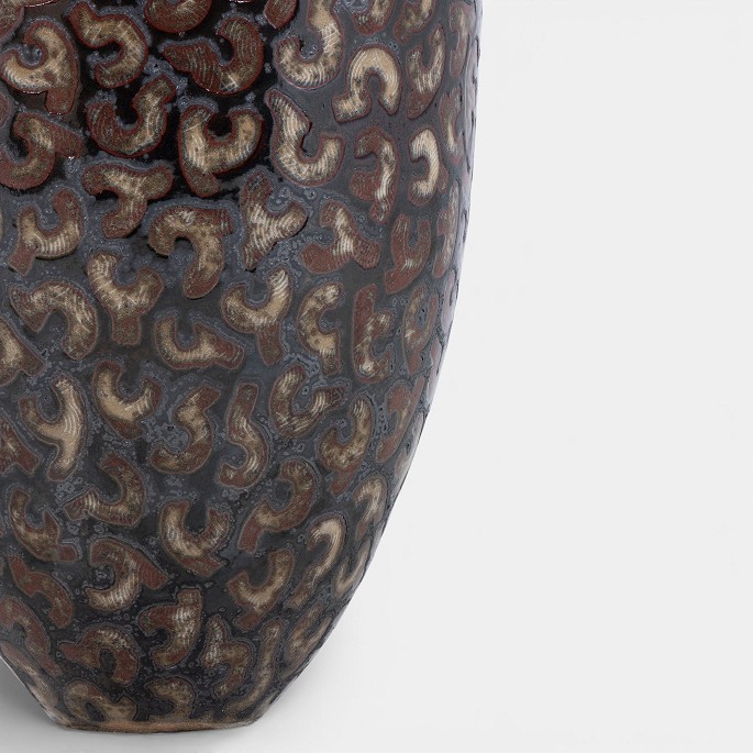 Colossal stoneware jar with black glaze and red decorations. Signed.