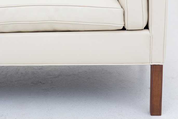 BM 2213 - Reupholstered 3-seater sofa in cream-colored Paris Cream leather with mahogany legs. We offer upholstery of the sofa in fabric or leather of your choice.