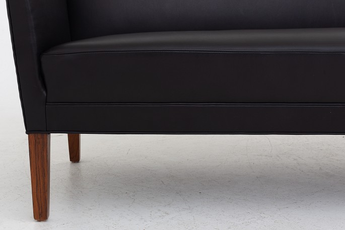 2-seater sofa in black leather and legs in rosewood.