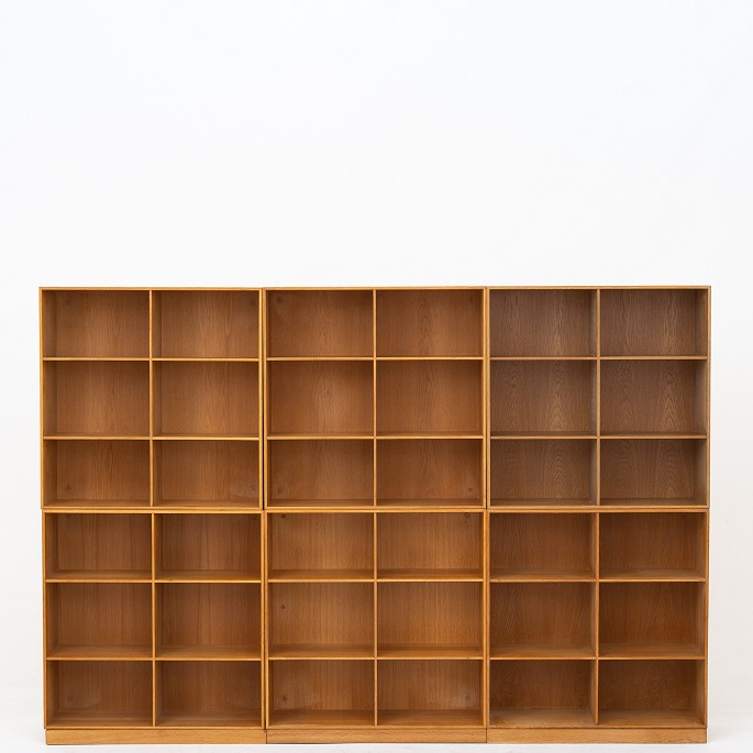 Sæt på fire bogkasser i patineret, massiv egetræ på 2 sokler.