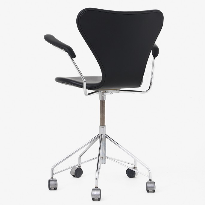 AJ 3217 - 'Syver'-kontorstol m. armlæn, nybetrukket i sort 'Elegance' anilin-læder på nyere stel af stål. KLASSIK tilbyder stolen i læder efter eget valg. Kontakt os venligst for mere information.