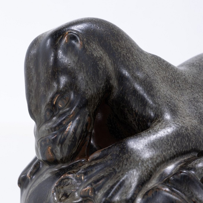 Skulptur af odder og fisk i stentøj. Stemplet.