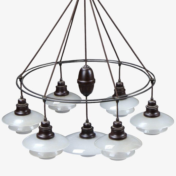 PH 2/2 - Sjælden ringkrone med midterhejs bestående af bruneret messing, fatninger af bakelit og seks arme af étlags matteret glas. Mærket 'Patented'. Cirka 1930.
