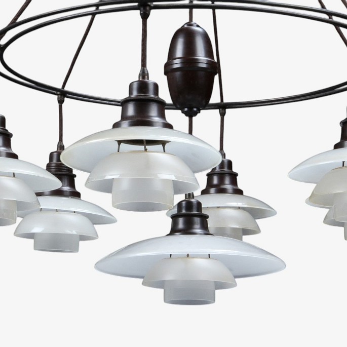 PH 2/2 - Sjælden ringkrone med midterhejs bestående af bruneret messing, fatninger af bakelit og seks arme af étlags matteret glas. Mærket 'Patented'. Cirka 1930.