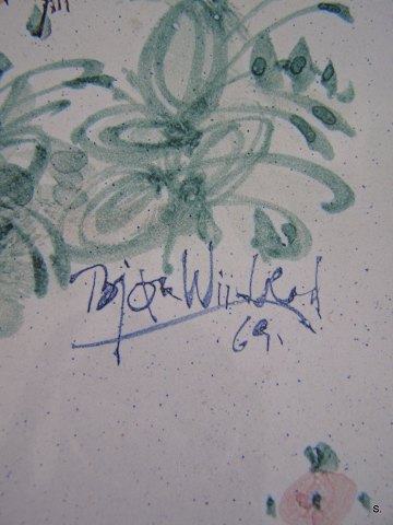 Bjørn Wiinblad Bakkebord på stand af bemalet træ H: 45 cm. Bakken der er signeret Bjørn Wiinblad 1969 H: 4 cm. L: 62 cm. og B: 44 cm. Emne nummer: 11191k