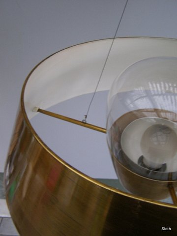 A.J. Pendel af messing, med wireophæng, hvidlakeret indvendig og midterdel med klar glaskuppel pæreformet H: 24 cm. D: 48 cm. Emne nummer: 12015