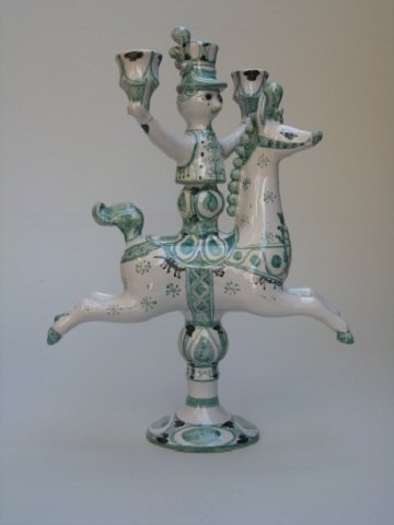 SOLGT Bjørn wiinblad, 1918-2006 En figurstage i form af en hest med rytter, af glaseret keramik sign. Bjørn Wiinblad 1986, h.41,5 l30 Emne nummer: 10136k