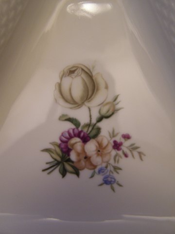Royal Copenhagen, 1881-910 Trekantet fad 14x14 cm, Frijsenborg Blomstermotiv på svejfet stel med guldkant Emne nummer: 10155k