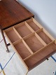 Palisander Sybord med udtrækkelig garnkurv i flet og rumopdelt skuffe. H: 53 cm. L: 60 cm. B: 43,5 cm.