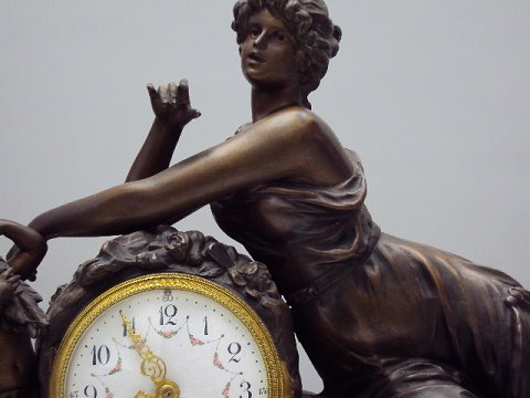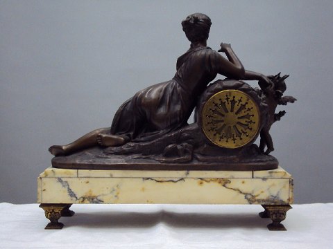 Gammel kaminur i jugendstil - patineret metal og broget marmor Længde 48 cm - højde 42 cm Uret er funktionsdygtigt Kan beses efter aftale