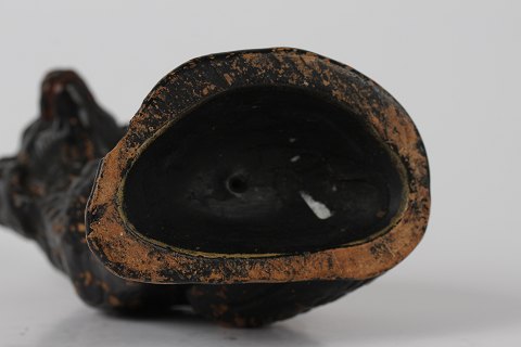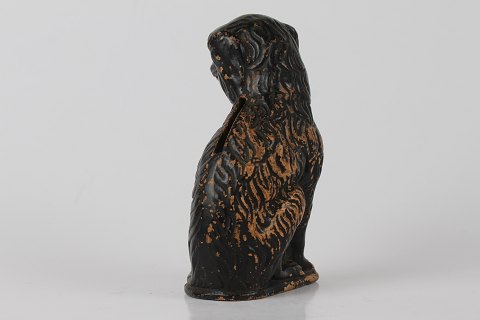 Old money box made of ceramics with mocca brown glazing and patina Shaped as a sitting dog Height 13 cm Nice condition with few scratches