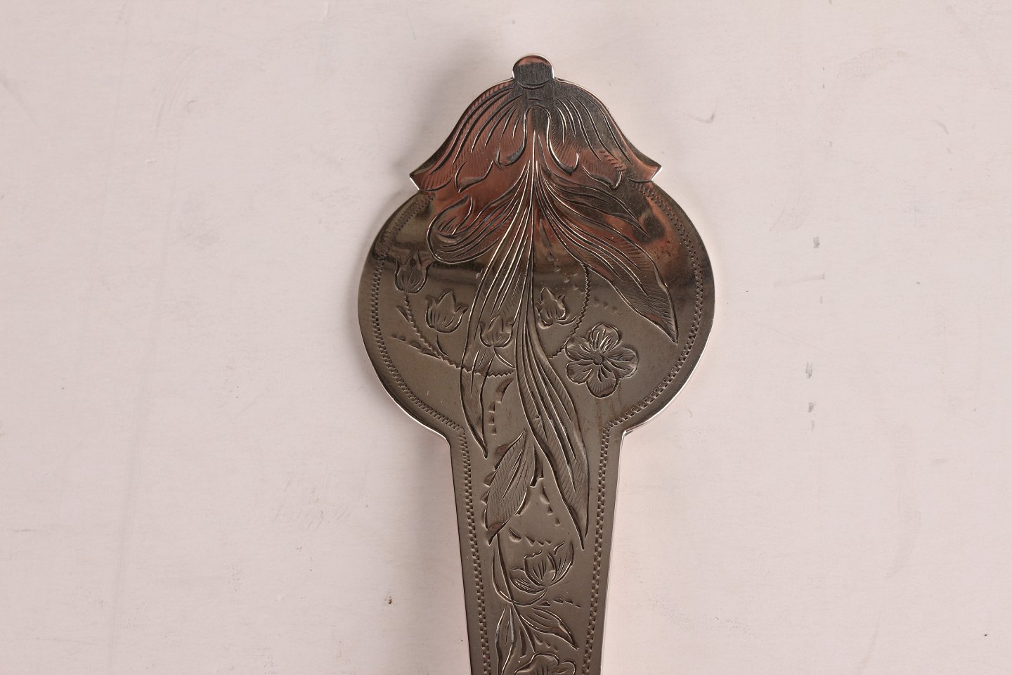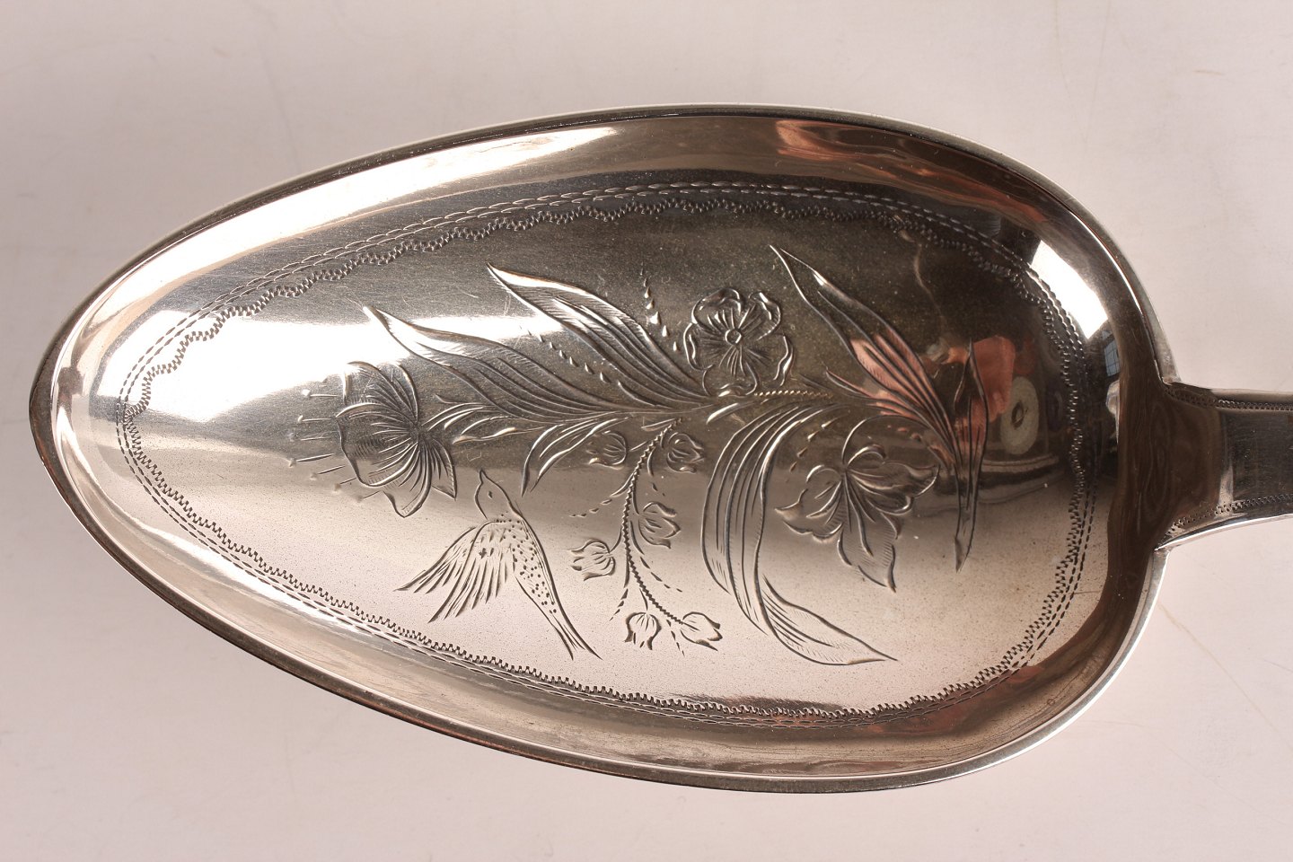 Dansk sølvsmede håndarbejde Serveringsske med floral mønster og fugl indgraveret Fremstillet af ægte 3 tårnet sølv med stempel fra 1903 Længde 28 cm Rigtig fin stand