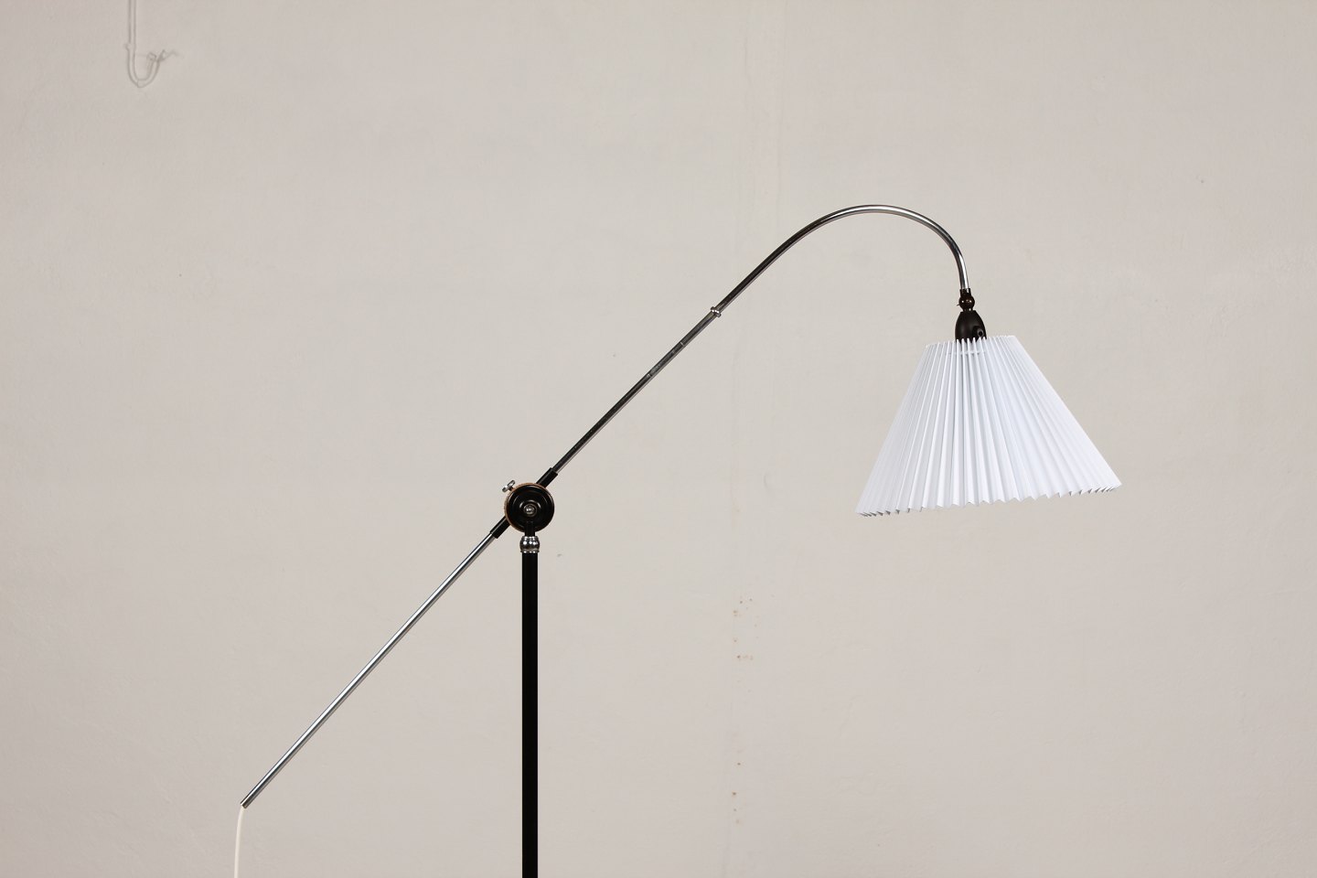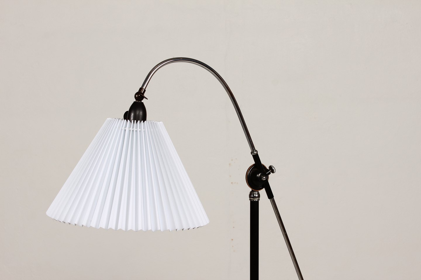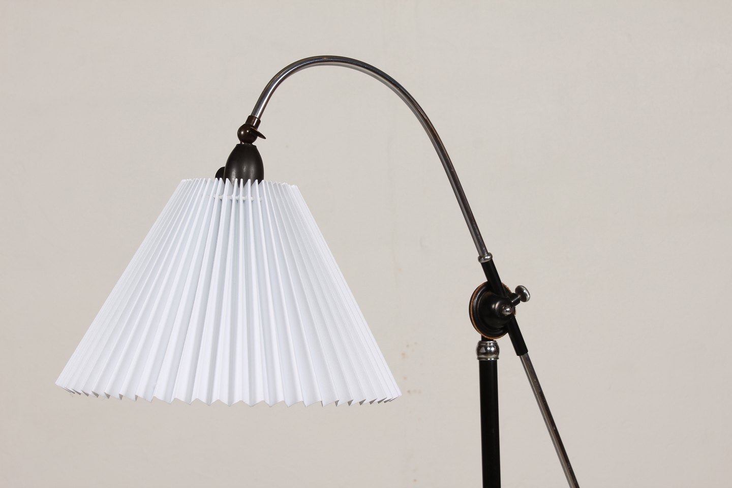 Dansk arkitekt Standerlampe af forkromet og sortmalet metal og støbejern med justerbar højde og kip Monteret med ny plisseret skærm Højde min 148 cm Fin funktionsdygtig stand Lampen kan beses efter aftale