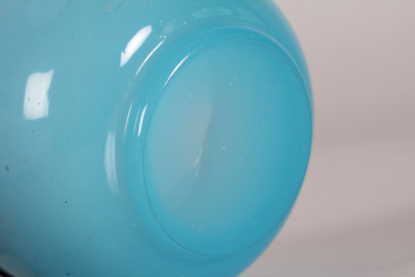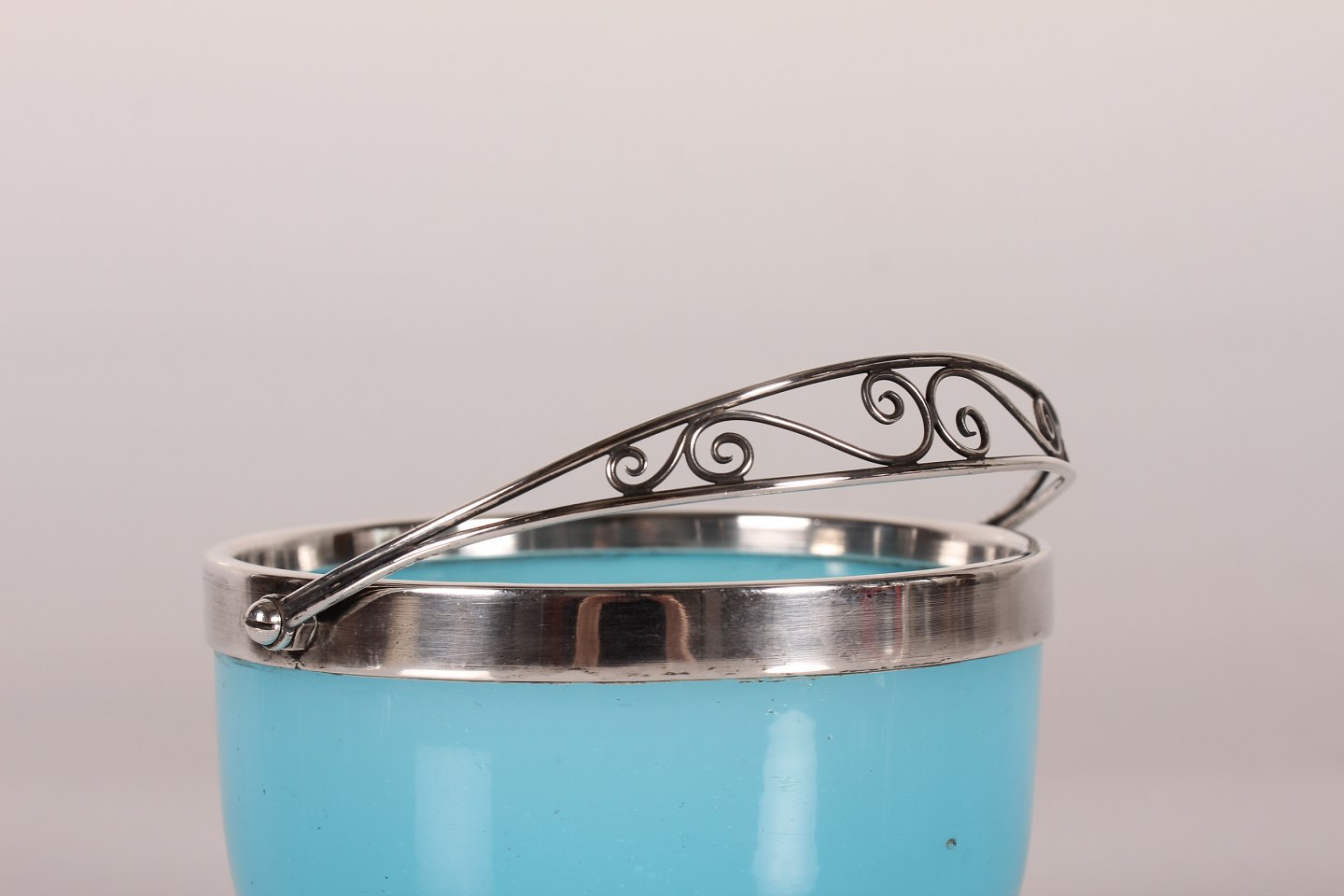 Gl. sukkerkumme eller kandiskål Fremstillet af lyseblåt glas med hank af forsølvet messing Højde incl. hank 13,5 cm Diameter 11,5 cm Fin fejlfri stand