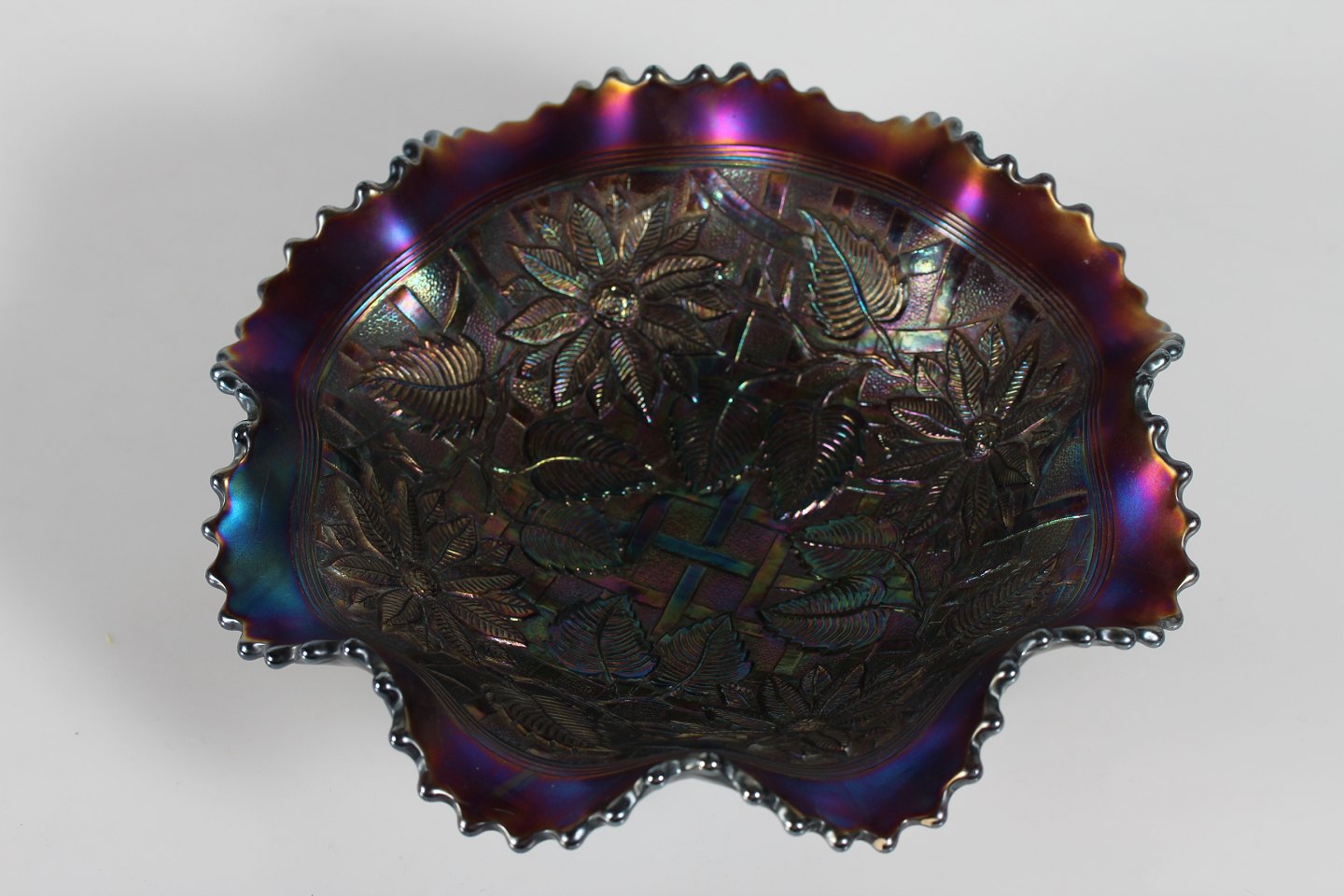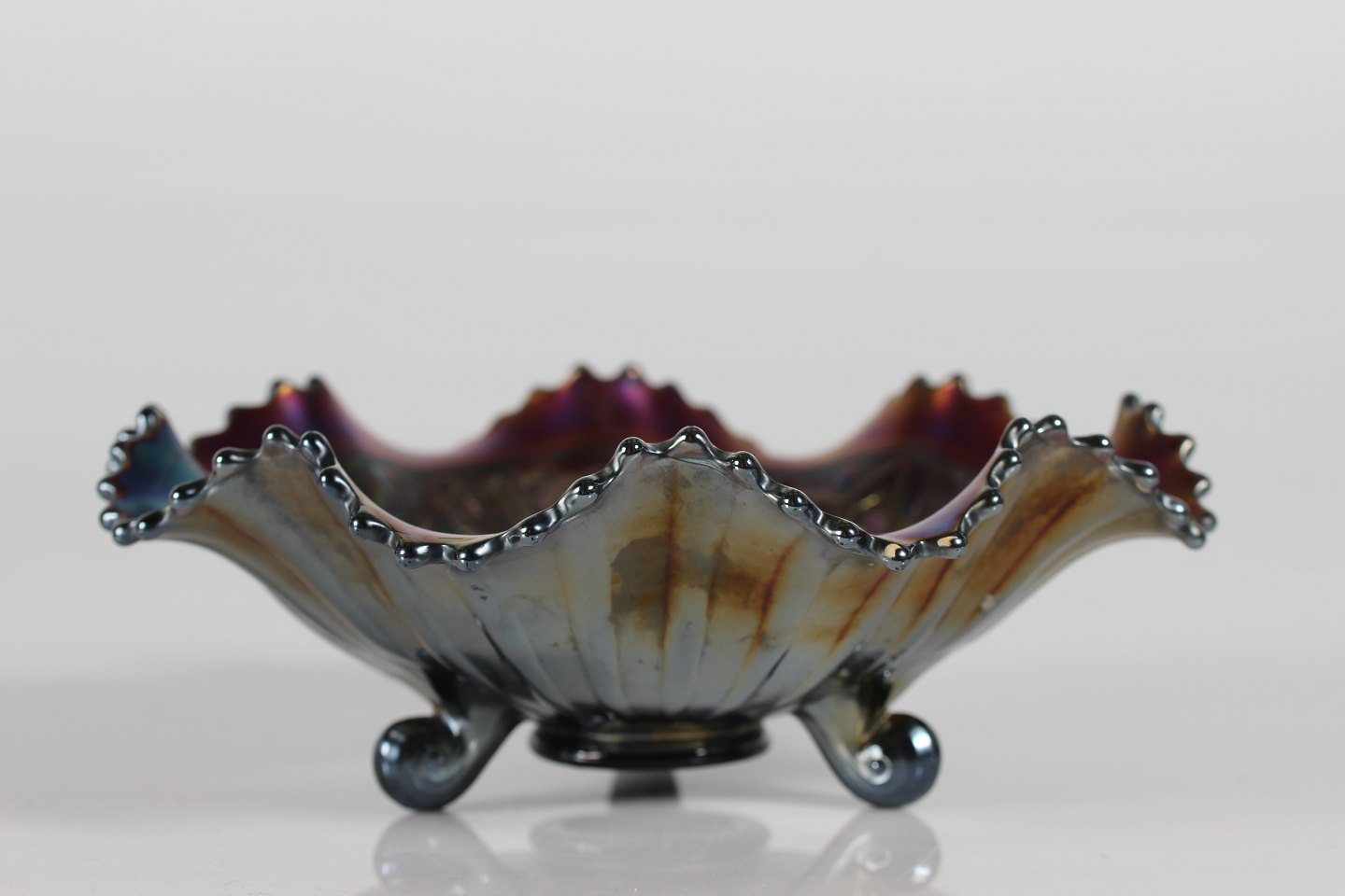 Kunstglas Gammel skål på lave fødder fremstillet af glas med farver i forskellige blålige nuancer Diameter 21 cm Højde 7,5 cm Fin stand uden skader