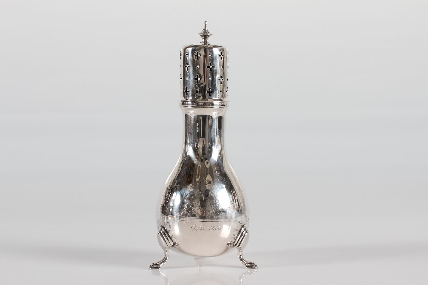 Stor sukkerstrøer med indgraverede motiver anno 1880