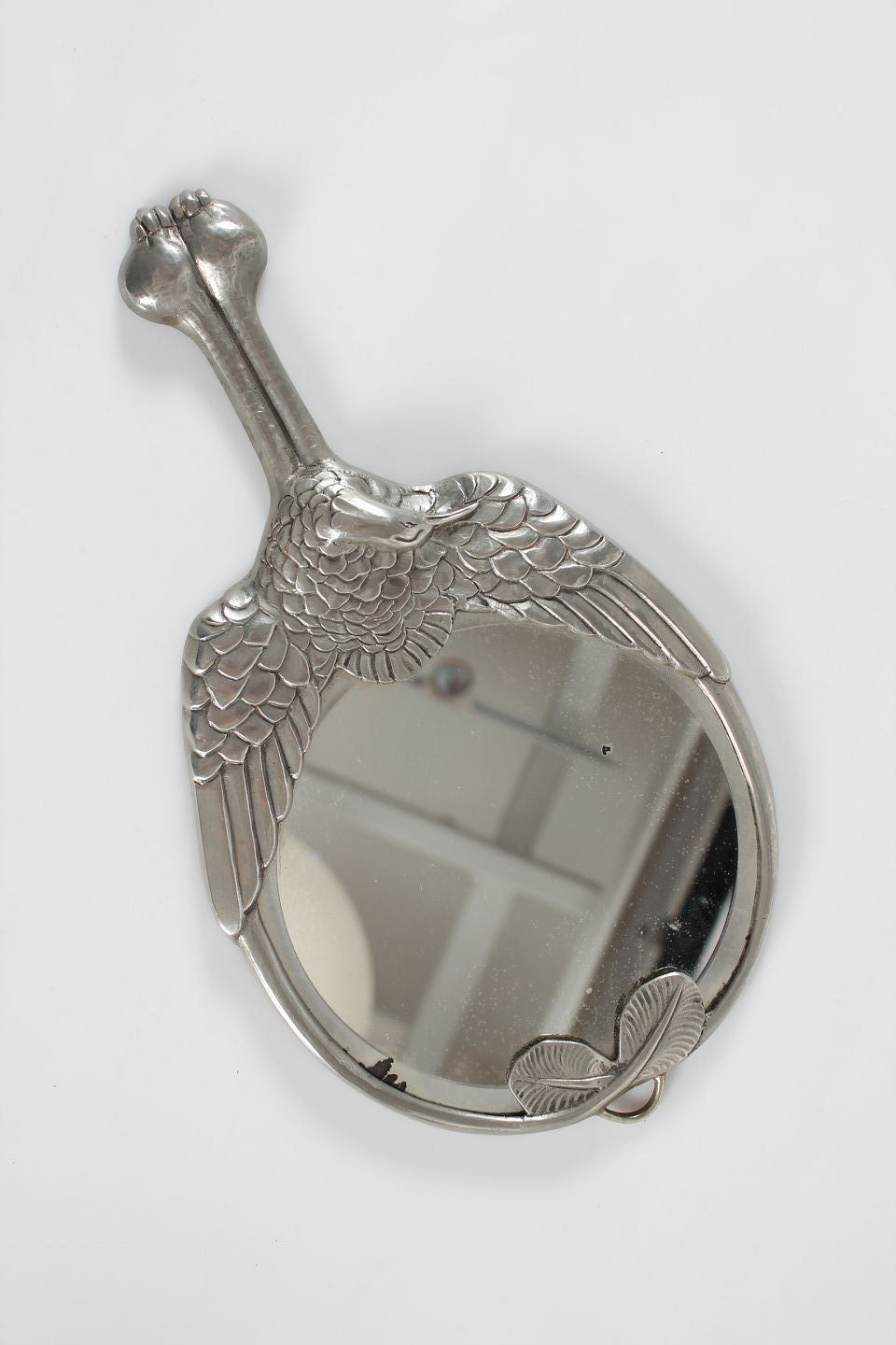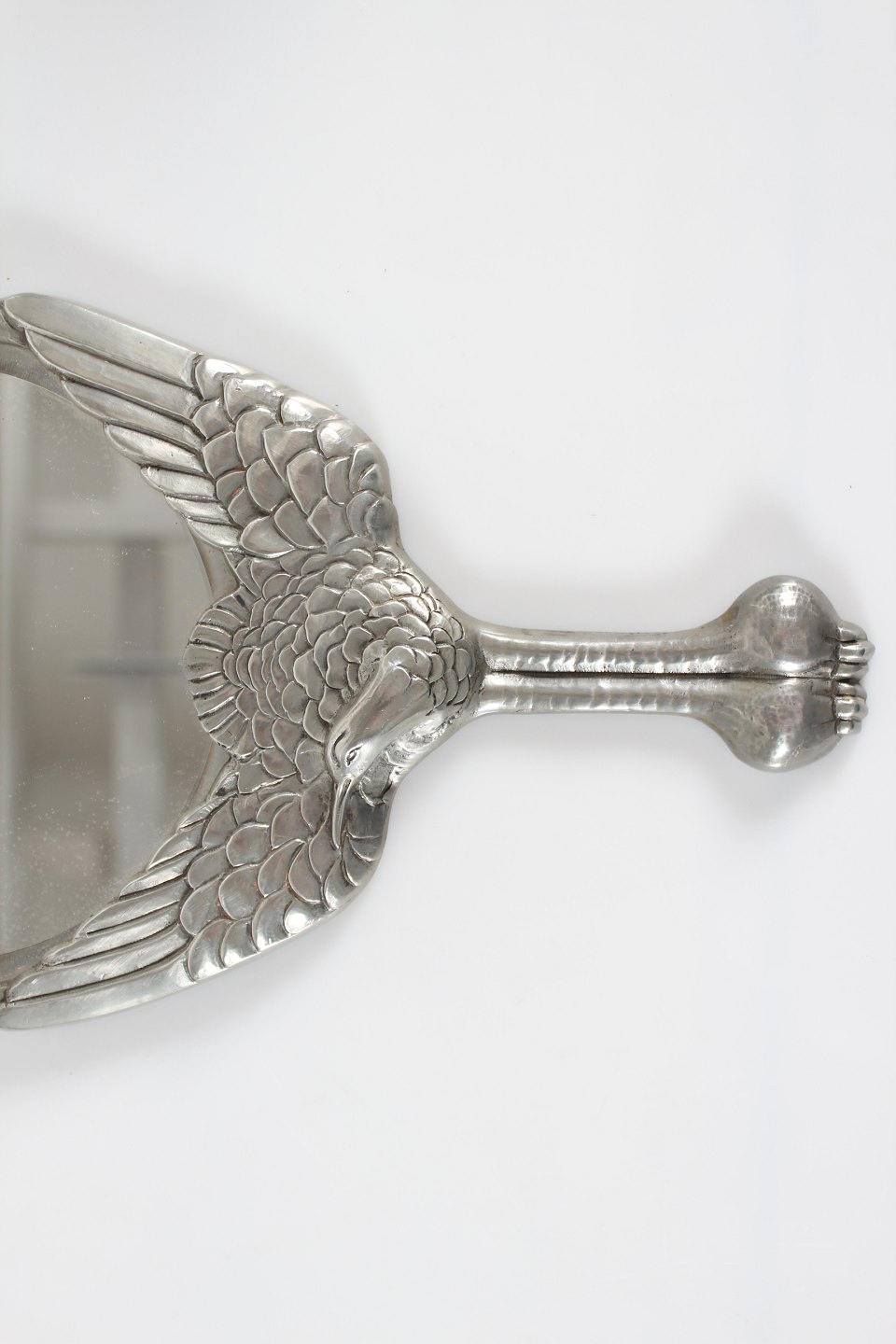 Mogens Ballin (1871-1914) Håndspejl af tin i skønvirkestil med håndtag udformet som trane Sign. monogram for Hertz Ballin Længde 33,5 cm Bredde 18 cm Producent: Hertz og Ballin Fin brugt stand - Spejlglas med let patina